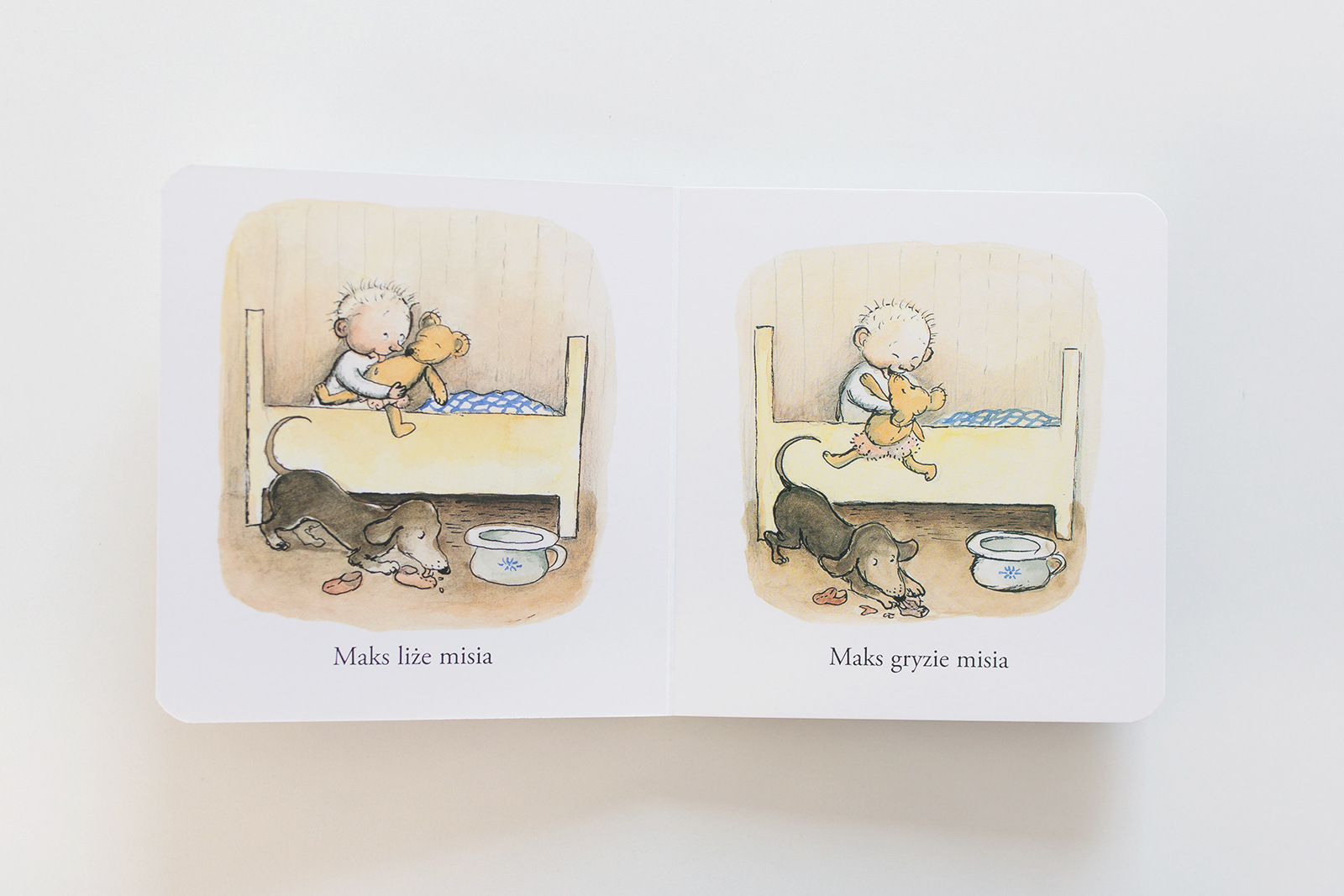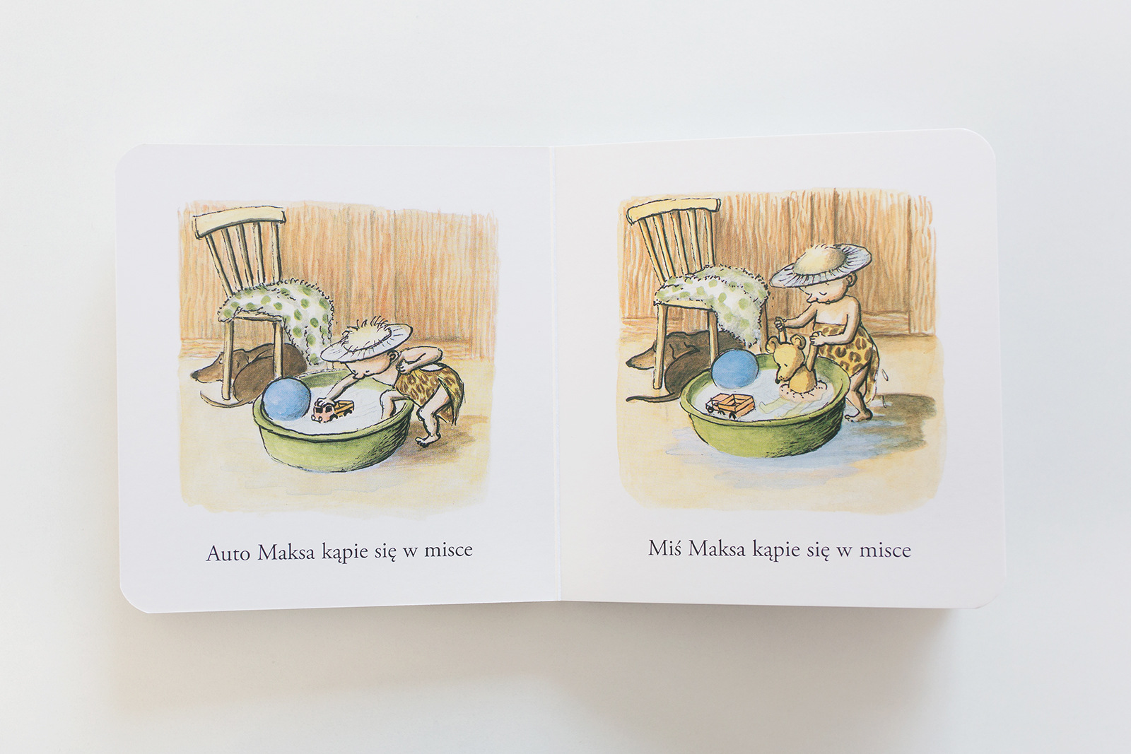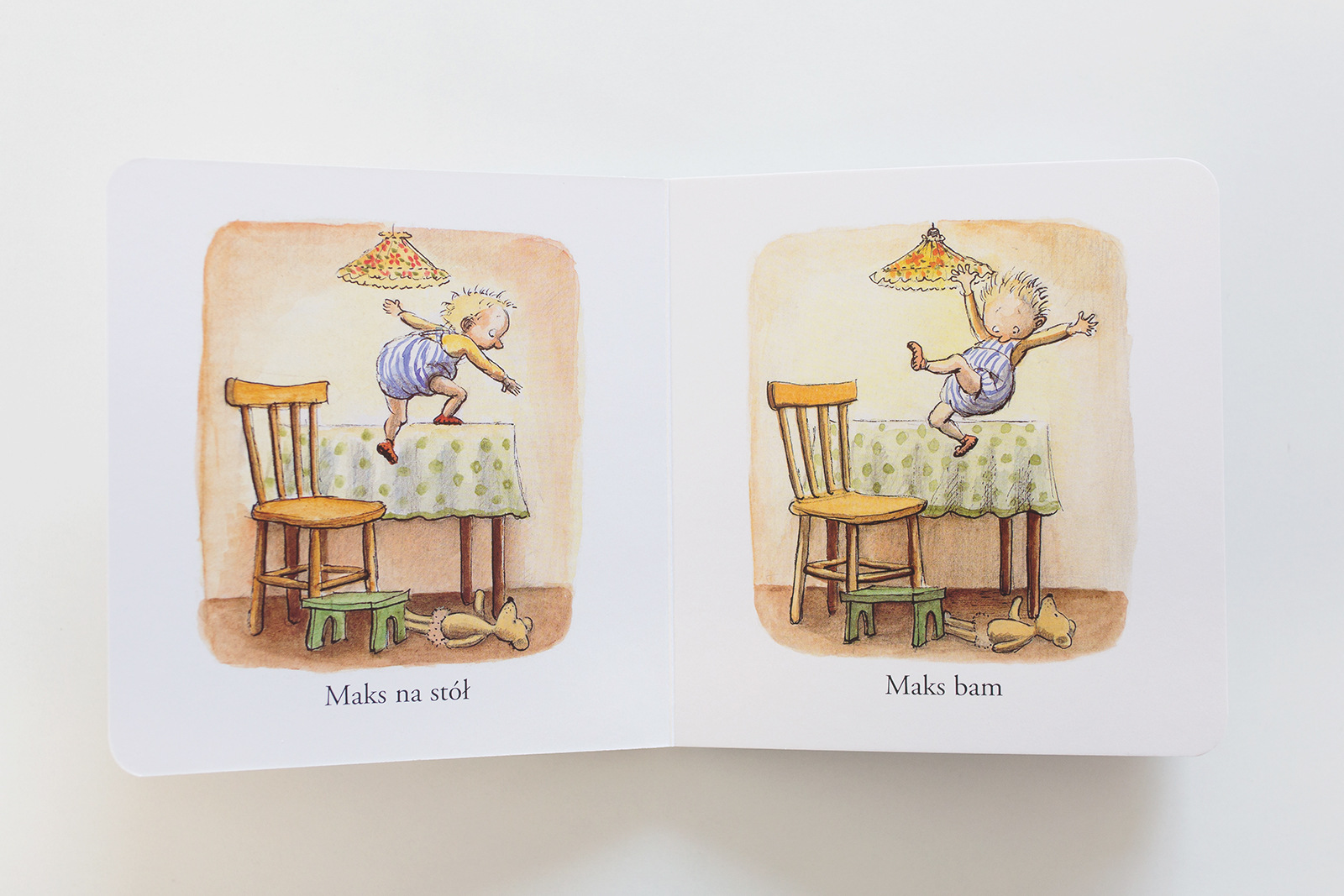 Zakamarki wydały już 10 książek z przygodami Maksa: na oko dwulatka, który lubi wszystko sprawdzić sam. Z perspektywy dorosłego mogą to być opowieści o brojeniu, z perspektywy dziecka – o odkrywaniu świata. Czyli o wspinaniu się na krzesło i spadaniu z niego, o chlapaniu wodą, o walce o zabawkę z drugim dzieckiem. Maksowi towarzyszy nieodłączny piesek, anielsko cierpliwy jamnik, któremu można założyć pieluszkę, i który daje się wykąpać w misce. Każdej z przygód towarzyszy szczęśliwe zakończenie, a my serię cenimy najbardziej za to, że swoim przekazem wspiera w dzieciach prawo do niezależności i samodzielnego doświadczania.