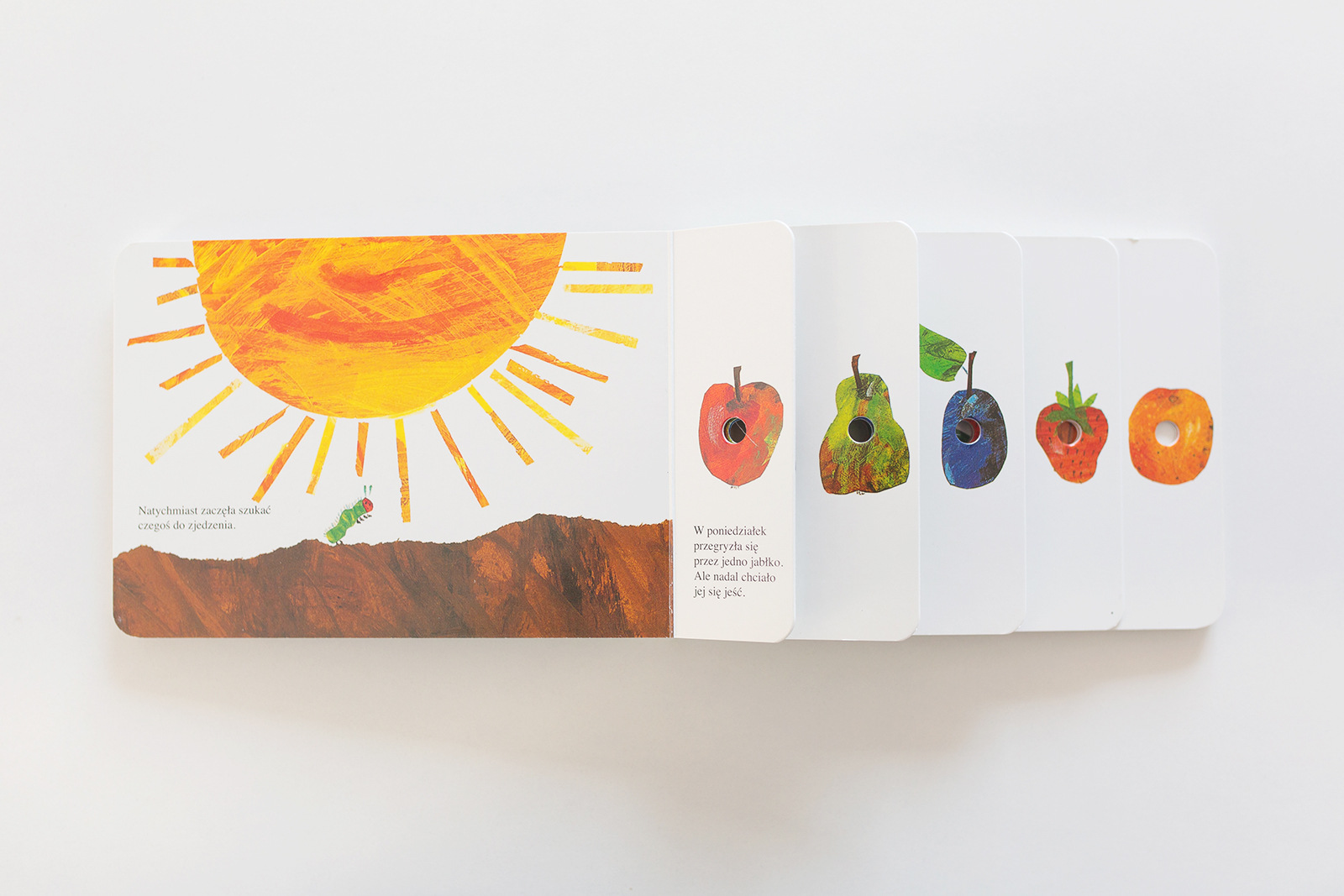 Bardzo głodna gąsienica, czyli pierwsza książka z dziurkami, to pozycja kultowa. Ma 40 lat, swoje wydania kolekcjonerskie, towarzyszą jej także serie ubranek i zabawek. Młodzi czytelnicy uczą się przez zabawę nazw potraw i towarzyszą rosnącej gąsienicy w magicznej przemianie. W Polsce znane jest również Od stóp do głów, które w czytanie angażuje całe ciało. Tatarak wciąż wydaje kolejne kolażowe książki niestrudzonego Erica Carla. Polecamy je wszystkie.