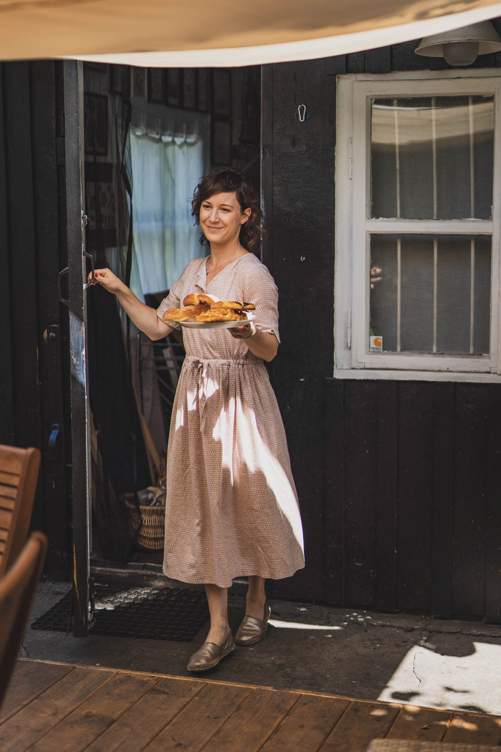 Justyna, która potrafi wygospodarować znacznie więcej niż 10 minut spokoju przy trójce dzieciaków, spędza tu często wolne letnie popołudnia. Być może nie należy do prężnej grupy pod wezwaniem „działka moje hobby”, ale chyba nieźle wkręciła się w miejskie sadownictwo. Kawałek własnej lub prawie własnej ziemi, drewniana chatka, domek dla dzieci, trochę kwiatów i warzyw oraz kącik leniucha – oto przepis na miejski relaks, nawet w tygodniu. Nasze ostatnie spotkanie w serii #apetytnalato, jakie realizujemy z marką Herbapol, upłynie dziś na nicnierobieniu po pracowitym dniu. Justyna wpadła tu na chwilę, zerwać pierwsze plony fasolkowe, oderwać się od planów, projektów i deadline’ów.