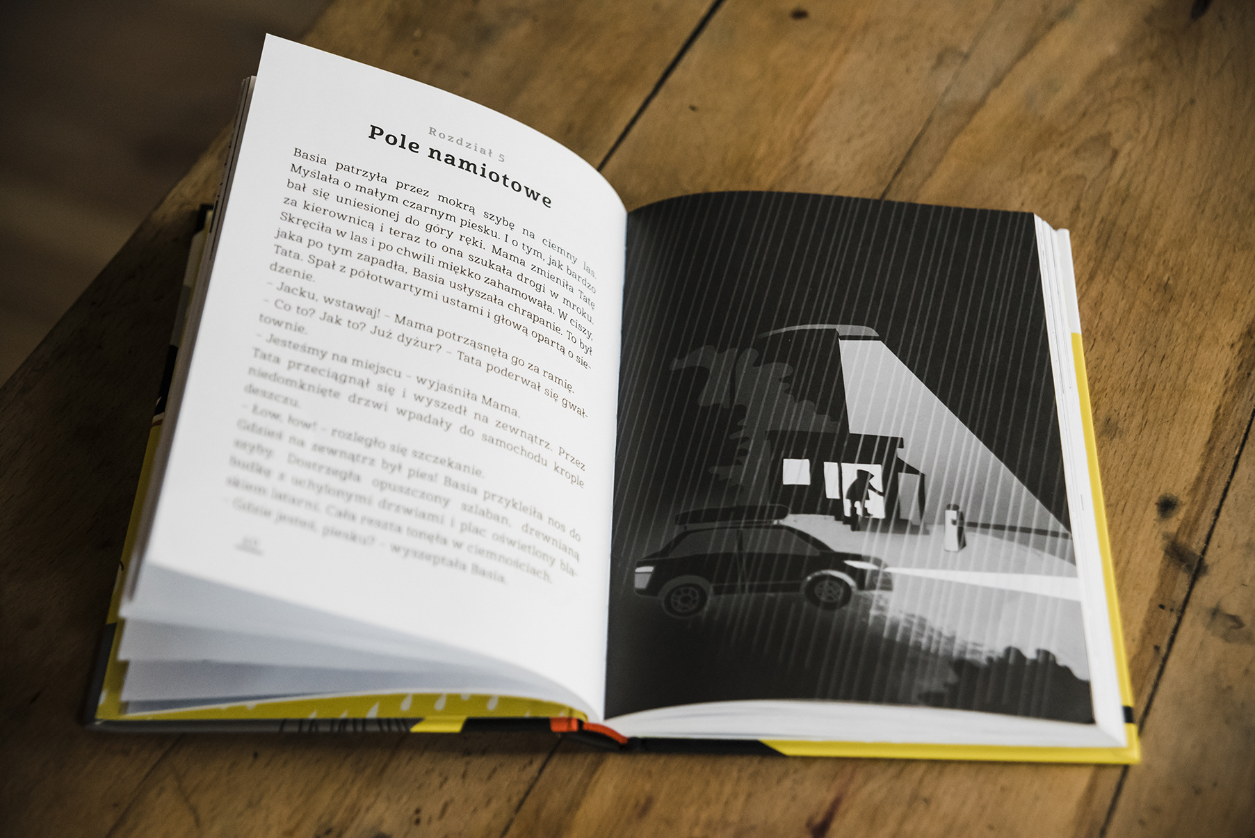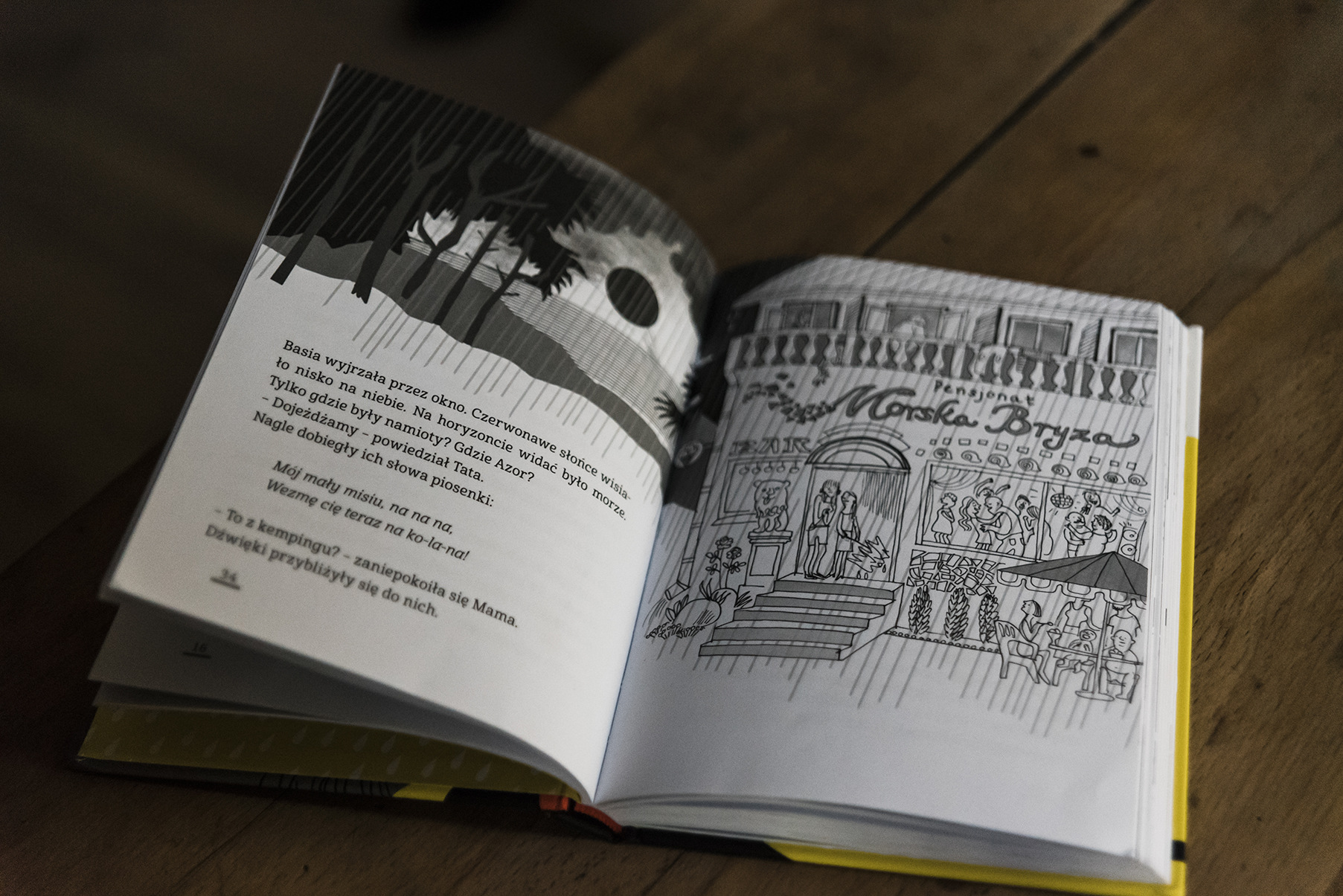W książce nie zabrakło też ilustracji. Biało-czarne grafiki Marianny Oklejak, świetnie dopełniają treść. Pomagają młodszym czytelnikom w skupieniu uwagi. Moja czterolatka zdecydowanie na nie czeka i studiuje je z dużym zainteresowaniem. Gustaw, poważniejszy już chłopak z zerówki, również prosi, by zostać przy nich na dłużej. To przypomniało mi takie uczucie z dzieciństwa, kiedy wyobrażony świat treści, wymagał pewnego porządku, łapiącego mnie w lekturze w pełnym wymiarze, taką rolę pełniły właśnie ilustracje.