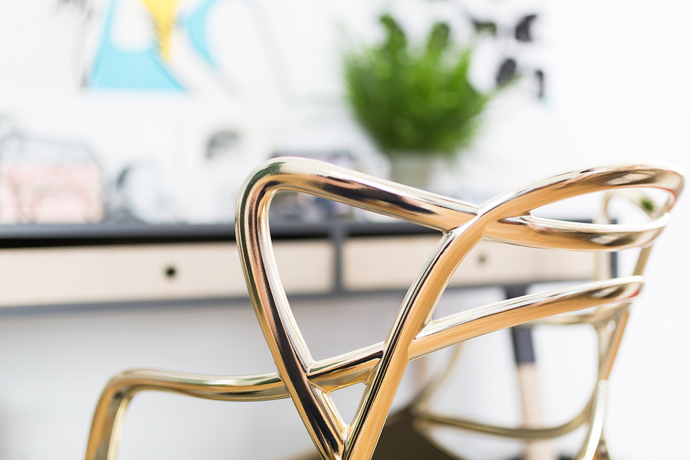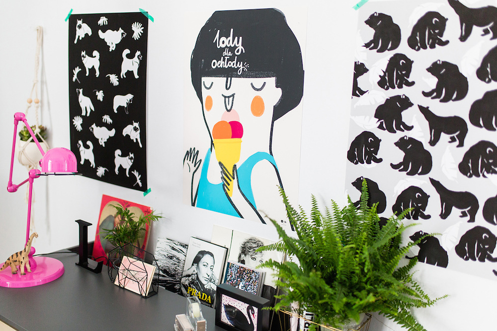 Pomysł okwiecenia miejsca naszej pracy jest świetnym sposobem na stworzenie relaksacyjnej atmosfery i kolorystyczne ożywienie. Do tego plakaty, nasza ulubiona część wystroju! To one najbardziej określą styl naszego biurka. Tak samo jak pokaźna lampa – tu możemy zaszaleć. Jeśli chodzi o krzesło, przede wszystkim powinno być dopasowane do sylwetki. Nasze – złote, z ciekawą konstrukcją – dodaje odrobiny ekstrawagancji i w całej aranżacji jest kropką nad i (znajdziecie je tu). Cała reszta zależy już od waszych przyzwyczajeń i tego, co lubicie najbardziej!