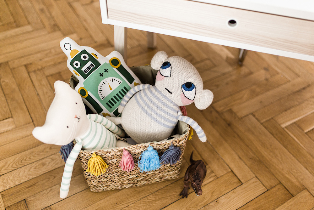 Które dziecko nie potrzebuje pojemnych szufladek, w których schowa różnego rodzaju skarby lub po prostu pomoce czy przybory do nauki albo szpargały? Nie zapominajmy też o plakatach, które poza funkcją ozdobną, służą celom edukacyjnym, tak jak ilustrowany plakat z alfabetem! (nasz znajdziecie tu). Jeśli mamy przestrzeń pod blatem, możemy postawić tam kosze na zabawki (np. poduchę-robota, na wszelki wypadek, gdyby znienacka dopadło znużenie).