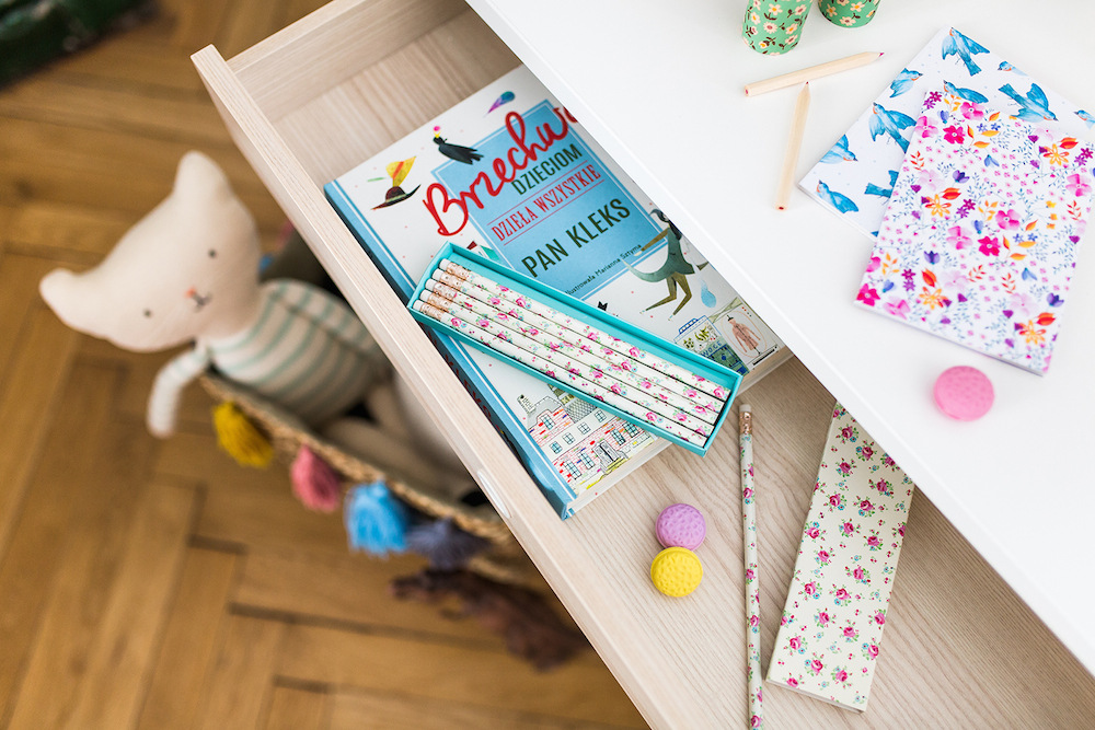To biurko jest niewielkie, ale bardzo funkcjonalne. Tak samo jak w biurku dziecięcym, istotną rolę odgrywają tu szuflady, dzięki którym nie musimy wszystkiego trzymać na widoku. W naszym biurku mamy je aż trzy, co pomaga w utrzymaniu porządku i segregacji najważniejszych rzeczy.