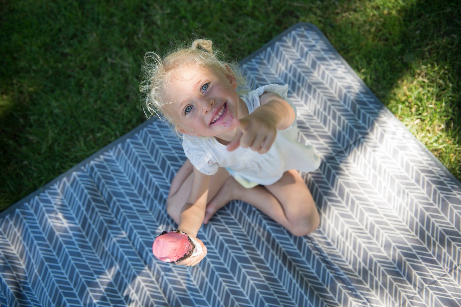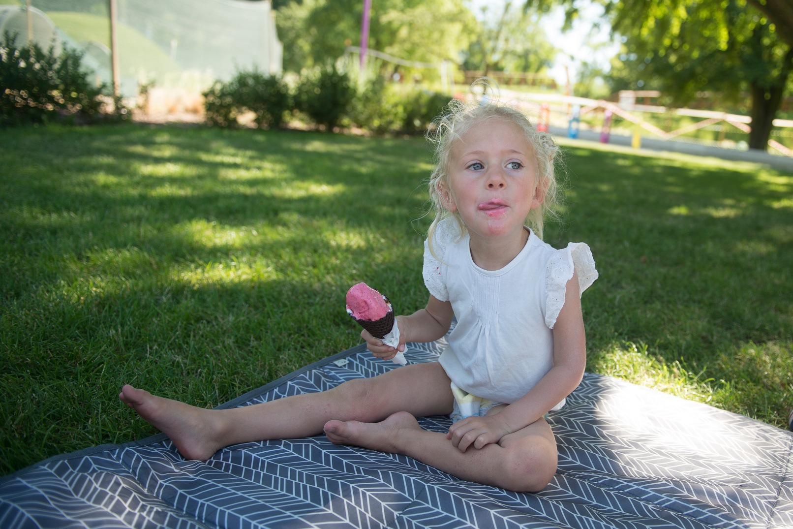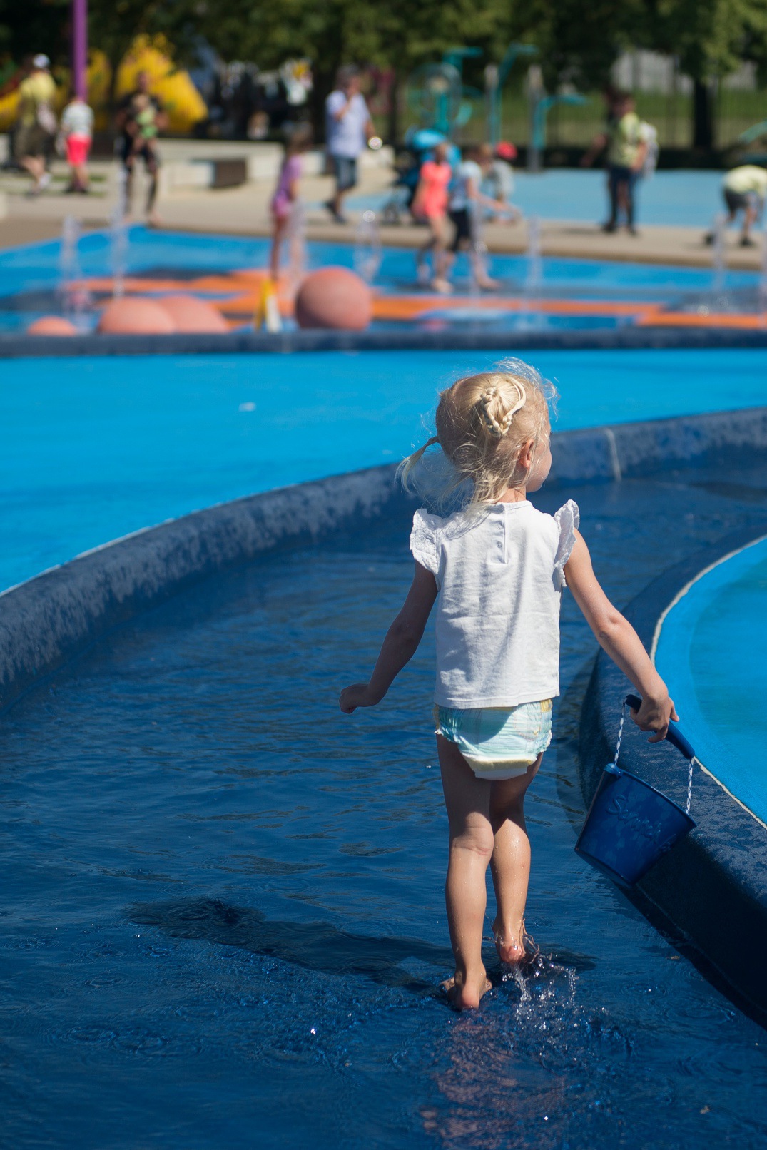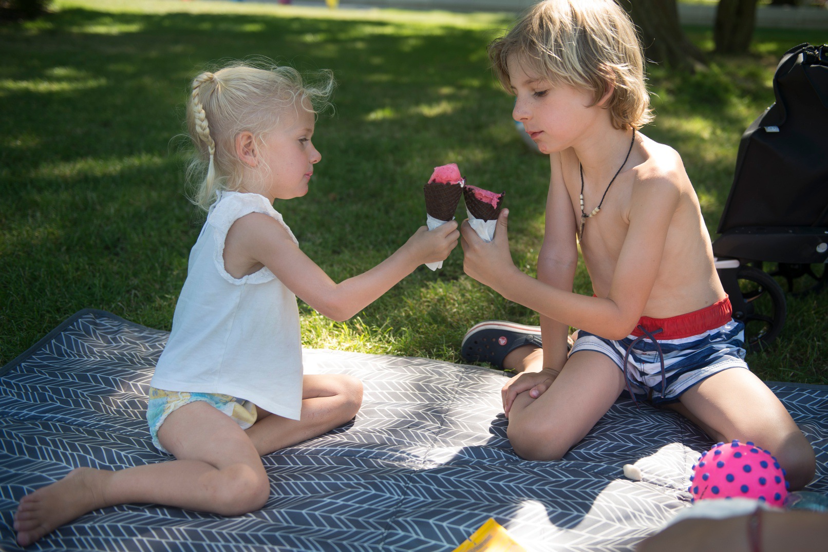 Leon i Mila to dwa żywioły, z których każdy podąża w swoim kierunku i każdy ma swój plan działania. Nadążyć za nimi ciężko, ale wizyta na placu zabaw w ciągu tygodnia ułatwia ich mamie to zadanie. Tłumów nie ma. Nie ma również kolejki do budki z lodami. Malinowe, waniliowe czy solony karmel? W przerwie pomiędzy fontanną, spryskiwaczami i rwącą rzeką ulubione smaki wskoczyły do wafelków. Mila nie ściąga pieluszki nawet na chwilę, w końcu zaraz ruszy za starszym bratem, pluskającym się w wodzie.