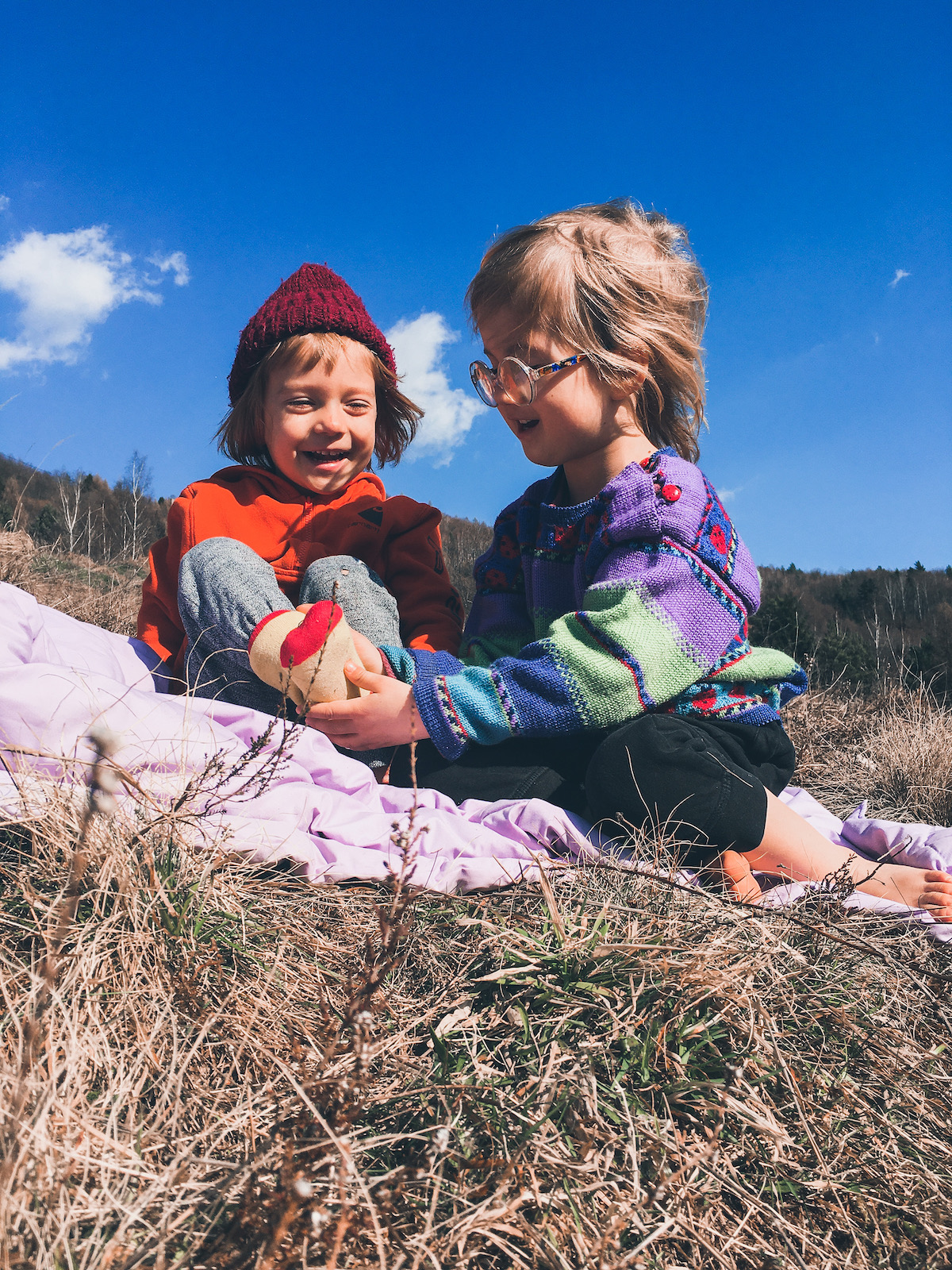 Jesteśmy trochę szczęściarzami, bo mój rodzinny dom stoi obecnie pusty, dlatego mogliśmy zawinąć się z Krakowa i spędzić tutaj ten trudny czas. Mieszkamy teraz na wsi, pod samym lasem, odseparowani o kilkaset metrów od innych domów. Jako rodzice czujemy komfort i jesteśmy ciutkę bardziej spokojni, zapewniając dzieciom bezpieczeństwo, a zarazem aktywności w znacznej mierze na zewnątrz. Wystarczy wyjść z domu, żeby za moment być w lesie, gdzie szansa na spotkanie kogoś jest zerowa. Dzieciaki bardzo lubią takie wycieczki połączone z poszukiwaniem skarbów, obserwacją natury i sprzątaniem łąki czy lasu. Do tego na naszym podwórku powstaje właśnie kuchnia błotna, a Franka zajmuje teraz majsterkowanie. W domu gotujemy na potęgę, udało nam się dostać drożdże spod lady, więc króluje gluten w każdej postaci (śmiech). Dziewczyny najchętniej szykowałyby lasagne na każdy dzień – w wersji vegan, oczywiście, a Franek, jako przyszły właściciel pizzerii, upiera się przy pizzy. Naprędce zorganizowaliśmy też maleńkie przyjęcie urodzinowe dla Miry. Do tego nadrabiamy planszówki, które kurzyły się na półce. Fajną sprawą są też spektakle dla dzieci, które np. Teatr Andersena w Lublinie udostępnił na swojej stronie. Staramy się jednak nie wypełniać dzieciom dnia aktywnościami po brzegi, pozwalamy im się też trochę ponudzić. Nuda to nic złego, zaraz obudzi się twórczość, kreatywność, i zaobserwujemy, jak ciekawe pomysły zrodziły się w małych głowach.