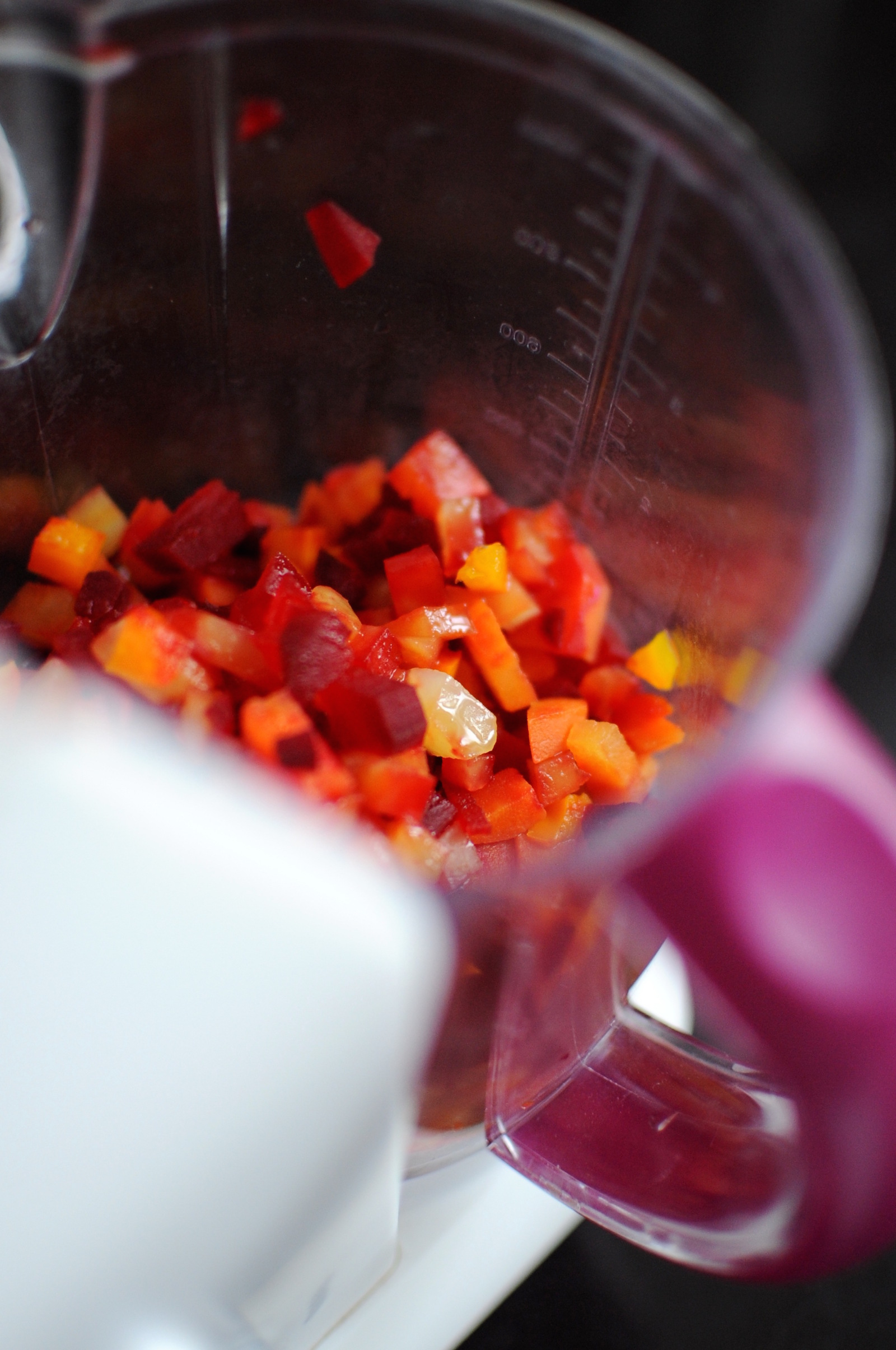 Buraka, ziemniaka i marchewkę obierz ze skórki. Pokrój w bardzo drobną kostkę, podobnie zrób z papryką. Wlej 3 miarki wody do Beaba Babycook i gotuj warzywa na parze, aż maszyna się wyłączy.
