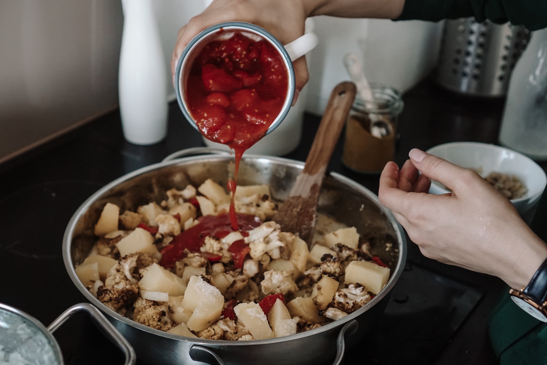 Kroimy paprykę w grubą kostkę, a cebulę w grube ćwierćtalarki. Oba warzywa wrzucamy do aromatycznej mieszanki na patelni. Zwiększamy temperaturę i smażymy, aż nieco zmiękną (możemy dodać odrobinę wody). Następnie dodajemy upieczony już kalafior. Ziemniaki schładzamy pod zimną wodą, obieramy ze skórki, kroimy na średnią kostkę i dodajemy do reszty, solimy. Teraz czas na mleko kokosowe, pomidory z puszki, masło orzechowe, cieciorkę, koncentrat i sos sriracha. Mieszając wszystko, doprowadzając do wrzenia, po czym zmniejszamy moc i gotujemy jeszcze przez 10 minut. Jeśli całość okaże się za kwaśna (dużo zależy od rodzaju pomidorów), dodajmy trochę miodu.