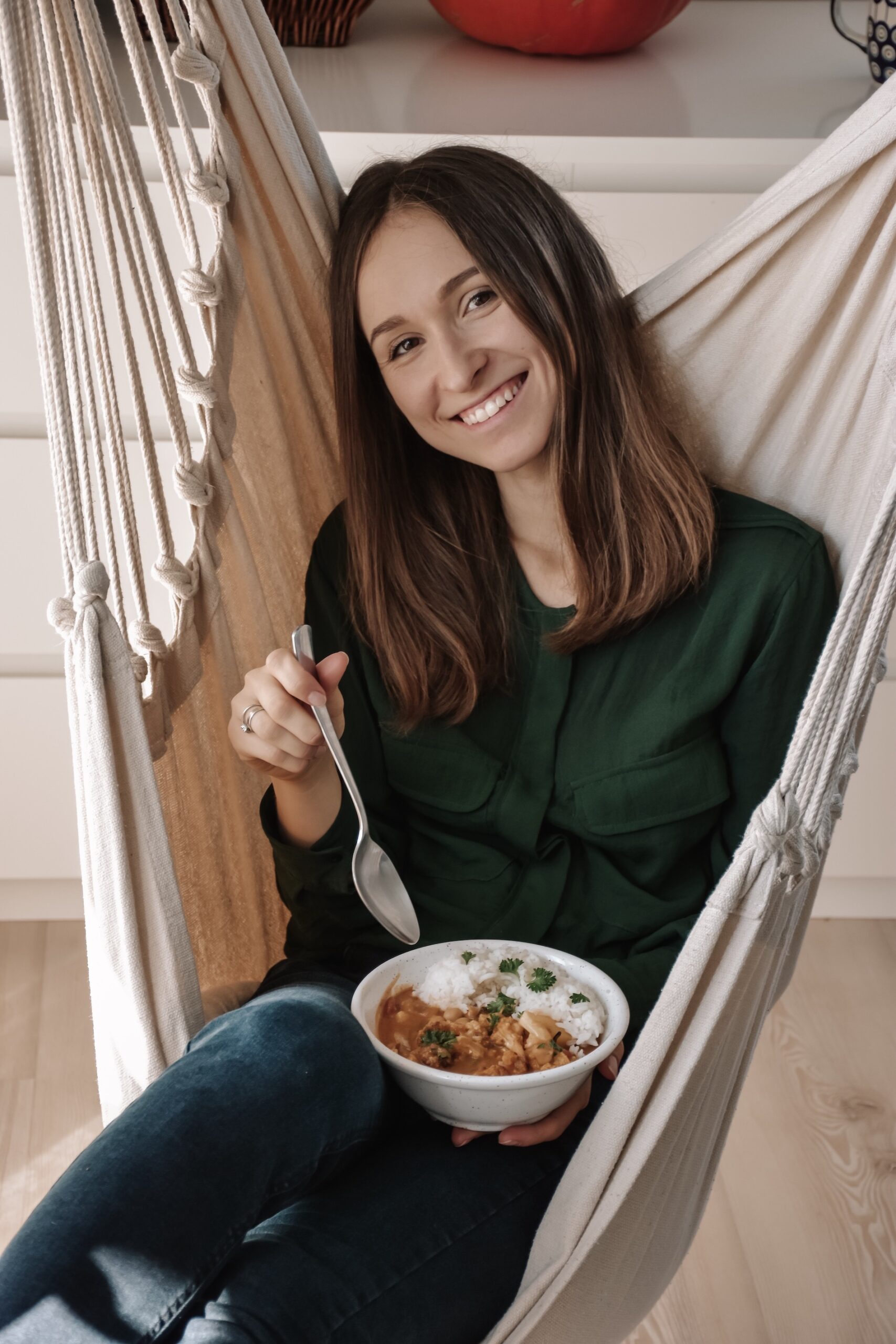 Z domu najbardziej pamiętam… rety, tyle smaków! Wegetariańskie gołąbki z ryżem i grzybami (do dziś proszę, by mama je przygotowała, gdy jedziemy do niej w odwiedziny). Indyjski ryż z soczewicą. Pulpeciki z twarogu i orzechów włoskich w sosie pomidorowym. Pasta eci-peci (pasta ze słonecznika i siemienia lnianego, którą wymyślili moi rodzice w akademiku). Kaszka kukurydziana z jagodami – bardzo często jedliśmy ją na kolację. Zupa z soczewicy. Pasta z migdałów. Mogłabym tak wymieniać. Mój dom kojarzy mi się z pysznym jedzeniem. Zawsze chciałam gotować choć w połowie tak dobrze jak moja mama. Chyba się udało!