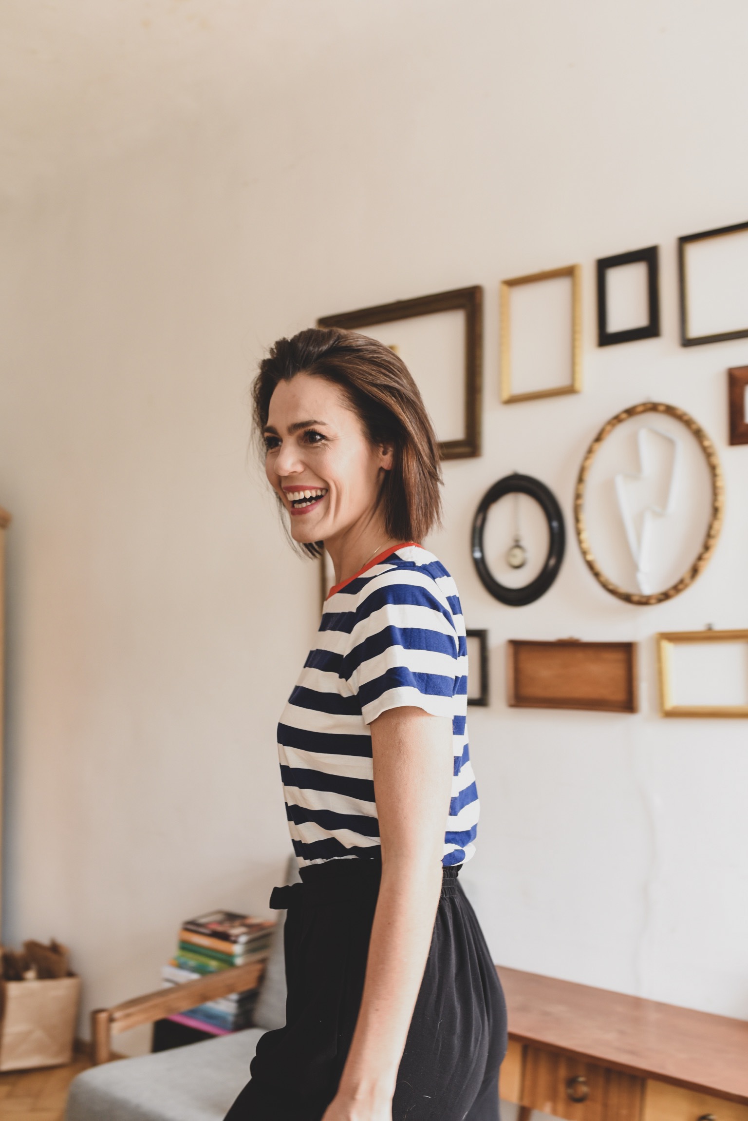 Mam wrażenie, że z wiekiem moda jest coraz mniej ważna. Niebawem stuknie mi rok bez kupowania ubrań (z wyłączeniem używanych) i w ogóle nie brakuje mi tych zakupów. Bardzo lubię biżuterię od polskich projektantów, jak Pola Zag, Matylda Zielińska i Natalia Kopiszka to moje ulubienice. Na Saskiej Kępie jest butik internetowego sklepu Cloudmine, tam mogę spędzić pół dnia oglądając przepiękne ubrania i przedmioty od polskich projektantów. A na co dzień, hmmm… Odprowadzam i odbieram syna z przedszkola odziana w dres. Po domu chodzę w dresie, bo i tak wszędzie jest psia sierść, więc nie ma sensu się stroić, bo szkoda ładnych ubrań. Mam też wrażenie, że nasyciłam się ,,ładnym ubieraniem” i w ogóle ,,ładnym wyglądem” za sprawą pracy. Im bardziej musiałam wyglądać odpowiednio ,,do kamery”, tym bardziej w życiu prywatnym stawiałam na wygodę. Nie maluję się na co dzień i uważam, że w dżinsach i trampkach wyglądam fajnie.