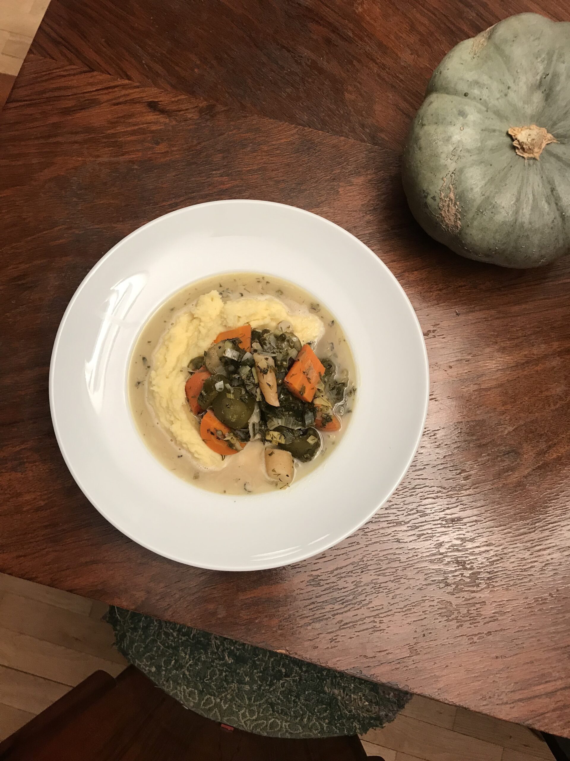 Marchewkę, pietruszkę, seler i por pokrój w mniejsze kawałki, następnie podsmaż na 80 g masła, tak żeby warzywa były brązowe. Następnie zalej je ok. 2,5 litrami wody, dodaj liście laurowe, ziele angielskie, posiekany koper, zioła prowansalskie i zielony pieprz. Zupę gotuj na małym ogniu, pod przykryciem, przez ok. 35 minut. W osobnym garnku ugotuj ziemniaki w osolonym wrzątku. Ugotowane ziemniaki zagnieć z pozostałą ilością masła i chrzanem. Na talerz nałóż porcję ziemniaków i podawaj je z ugotowaną zupą.