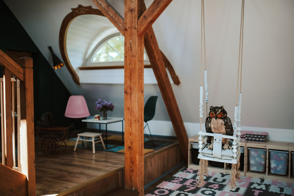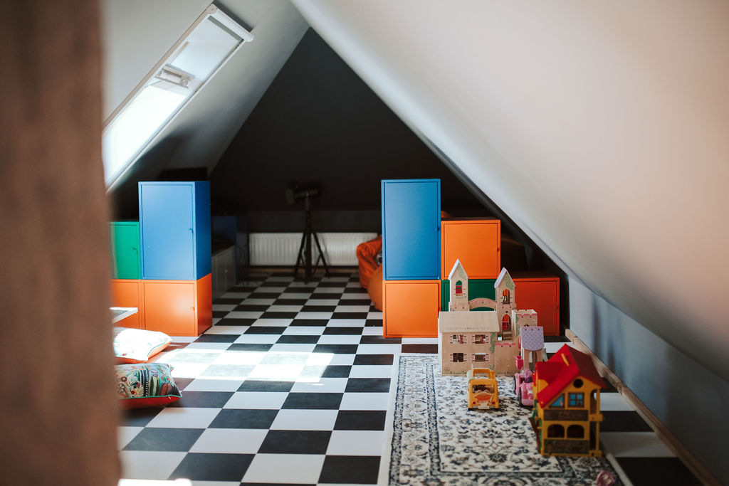 To miejsce jest po prostu stworzone dla dzieci! Zacznę może od ogrodu, po jego przejściu wyłania nam się prawdziwy raj! W gąszczu drzew ukryta jest ogroooomna piaskownica, a tam tipi i mnóstwo zabawek. Tunele, koparki do piasku i bazy, marzenie każdego podwórkowego dziecka! Sam dom jest duży, spokojnie – jest gdzie pobiegać. Właściciele pomyśleli o maluchach, które mają na pietrze swoje miejsce, bezpieczne, miłe i słoneczne, a obok niego miejsce na kawę, gdzie rodzice spokojnie mogą mieć dzieci na oku. Natomiast dla starszaków przeznaczone jest poddasze, które aż się prosi, żeby tam popsocić. Stoliki do rysowania, tablica do bazgrania kreda, mnóstwo gier i książek, i ten pociąg! Aha, co ważne dla tatusiów, na poddaszu jest konsola i mnóstwo gier (śmiech). Żeby móc spokojnie posiedzieć i „popilnować” szalejące tam starszaki. A pokoje? Pokoje są bardzo przytulne, piękne! Każdy ma inny kolor i własną łazienkę z prysznicem. Jest jak najbardziej przystosowany dla dzieci. Ten, w którym mieszkaliśmy, był z antresolą – dla nas raj!