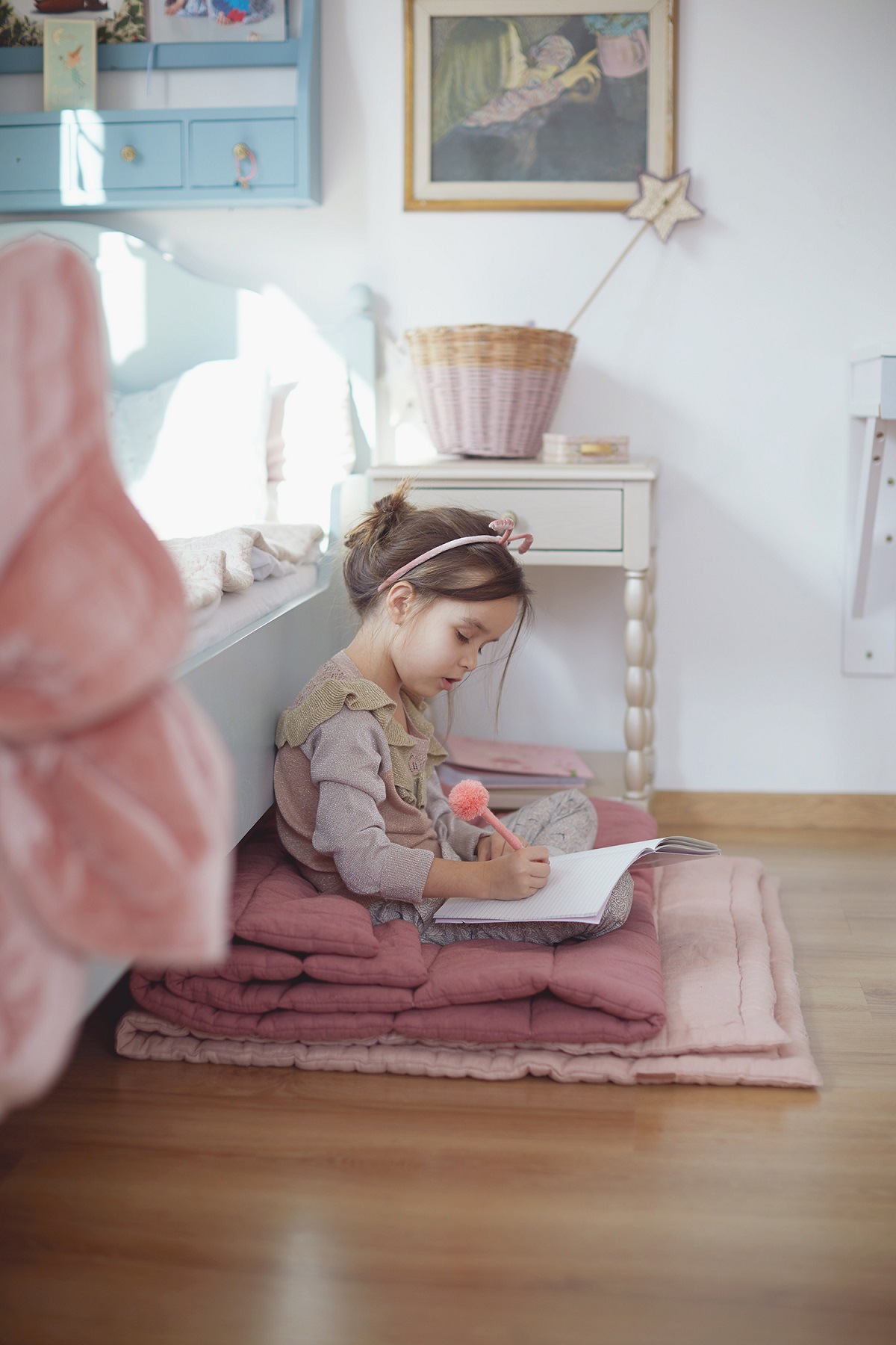 Superdziewczęce bluzy z aplikacjami, otulające swetry i spodenki z falbanami, całe w lśniących drobinkach, to najnowsze propozycje marki MarMar Copenhagen i Bonheur du Jour. Obie ulubiły sobie lekkość i pastele, dlatego tak dobrze komponują się z dziewczyńskimi kącikami Gai i Nadii, wiklinowym fotelem i łóżeczkiem ze szczebelkami. Luźne piżamowe spodnie to świetna wymówka, żeby trochę dłużej zostać w łóżku.