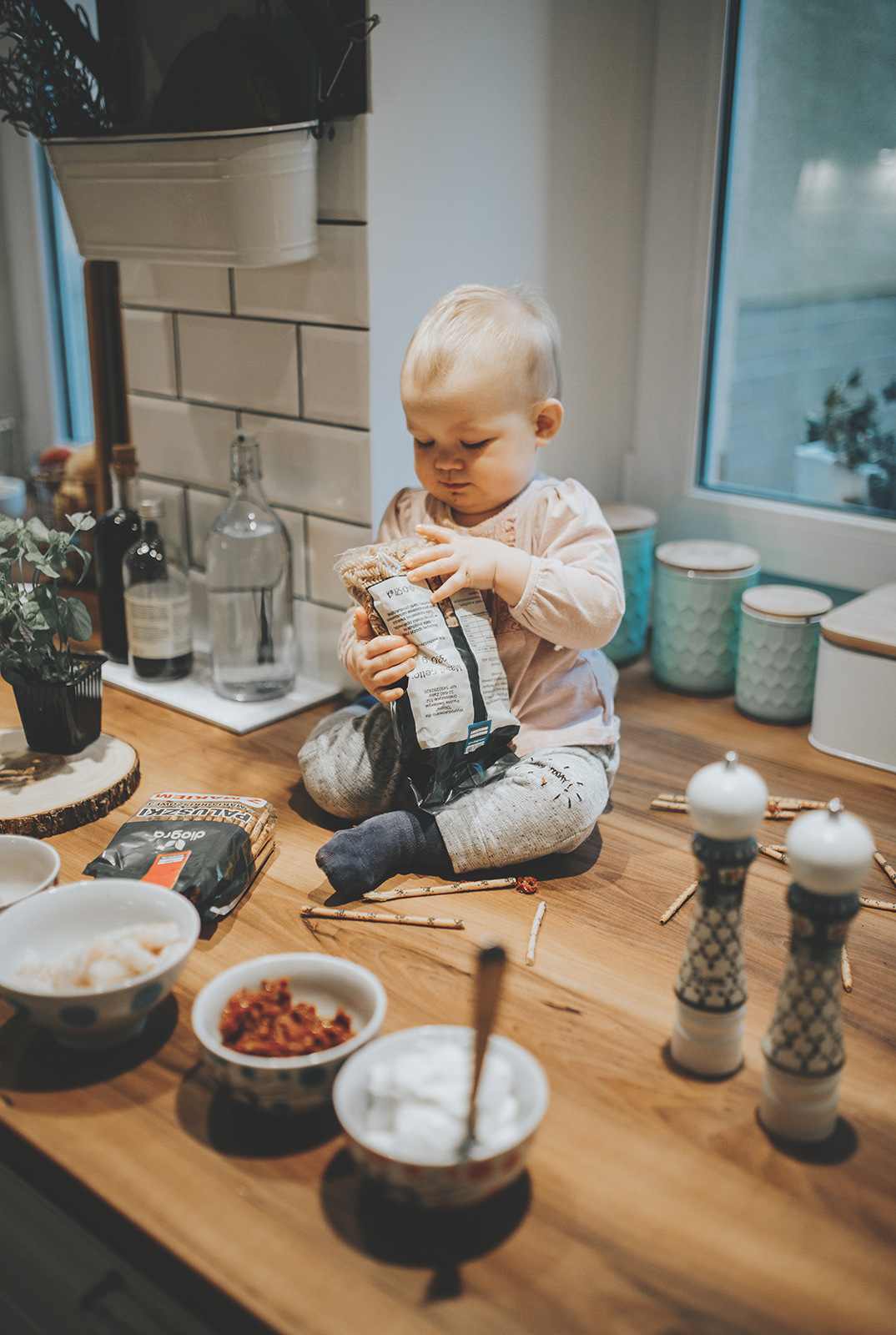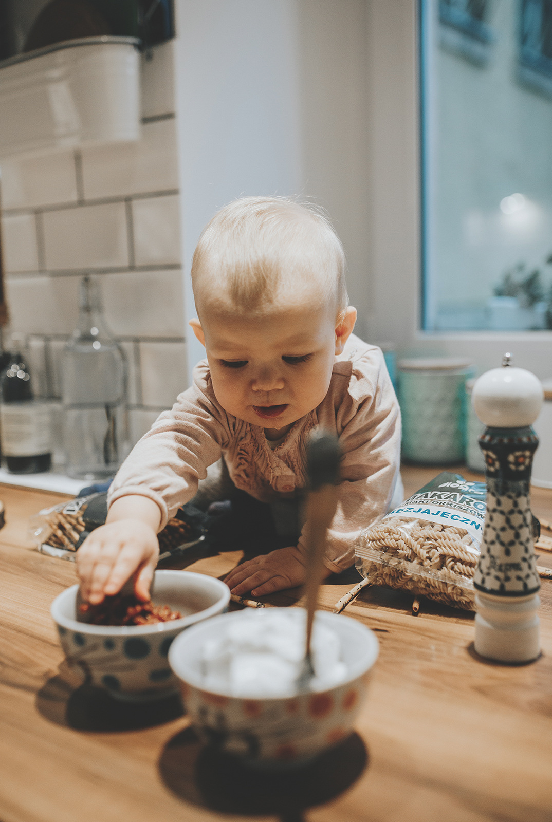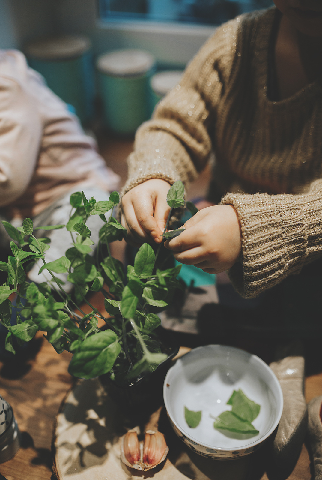 Hania i Hela tworzą zgrany duet. Jedna wkłada, druga wysypuje. Jedna skubie liście mięty, druga sięga po suszone pomidory. Widać, że miejscówka na blacie to niezły punkt dowodzenia i nie pierwszy raz eksperymentują kulinarnie.
