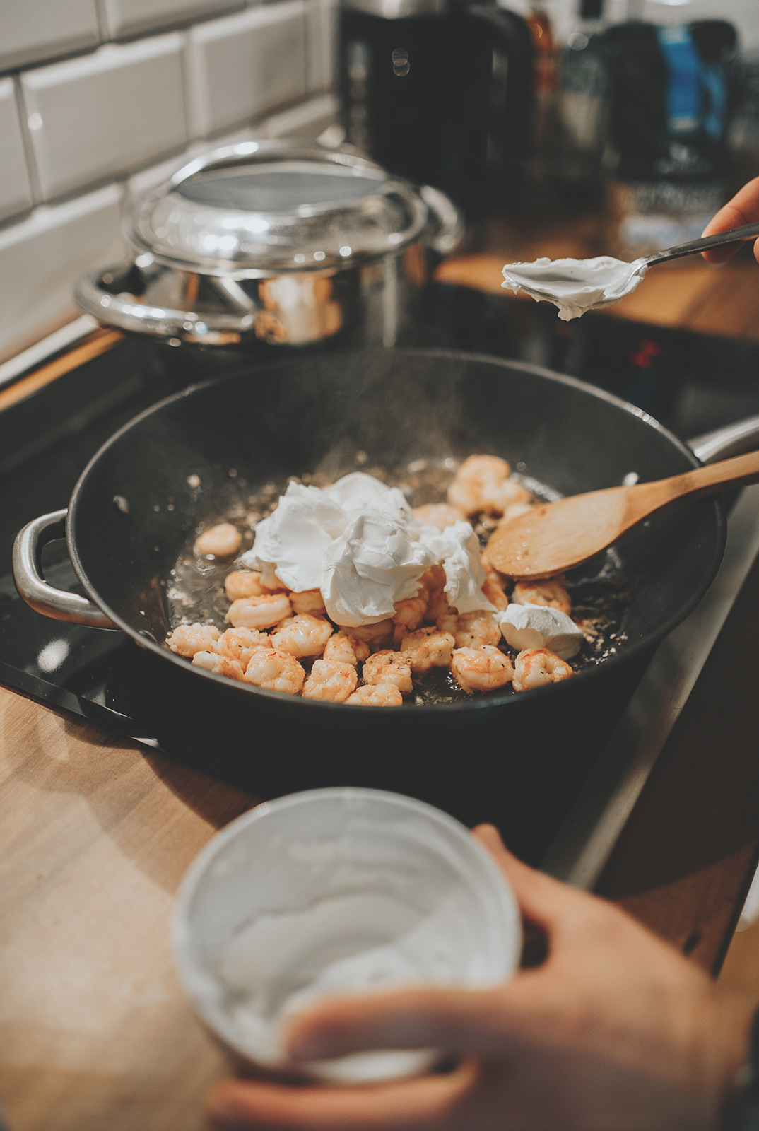 Przepis super prosty! Na rozgrzaną patelnię wrzucamy posiekany czosnek, następnie gdy się zeszkli, dodajemy rozmrożone i oczyszczone wcześniej krewetki. Kiedy krewetki się podsmażą dodajemy serek oraz resztę składników.