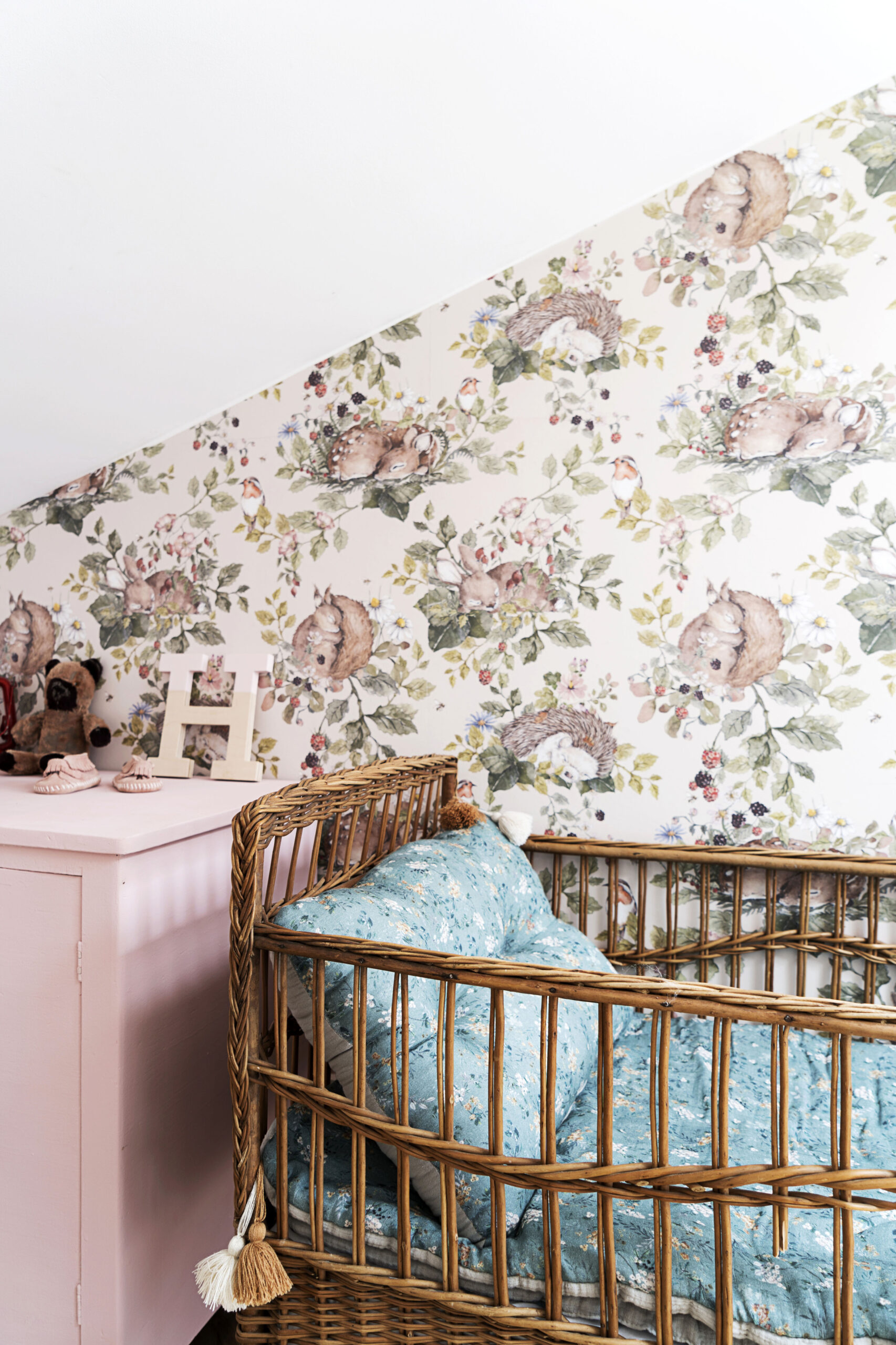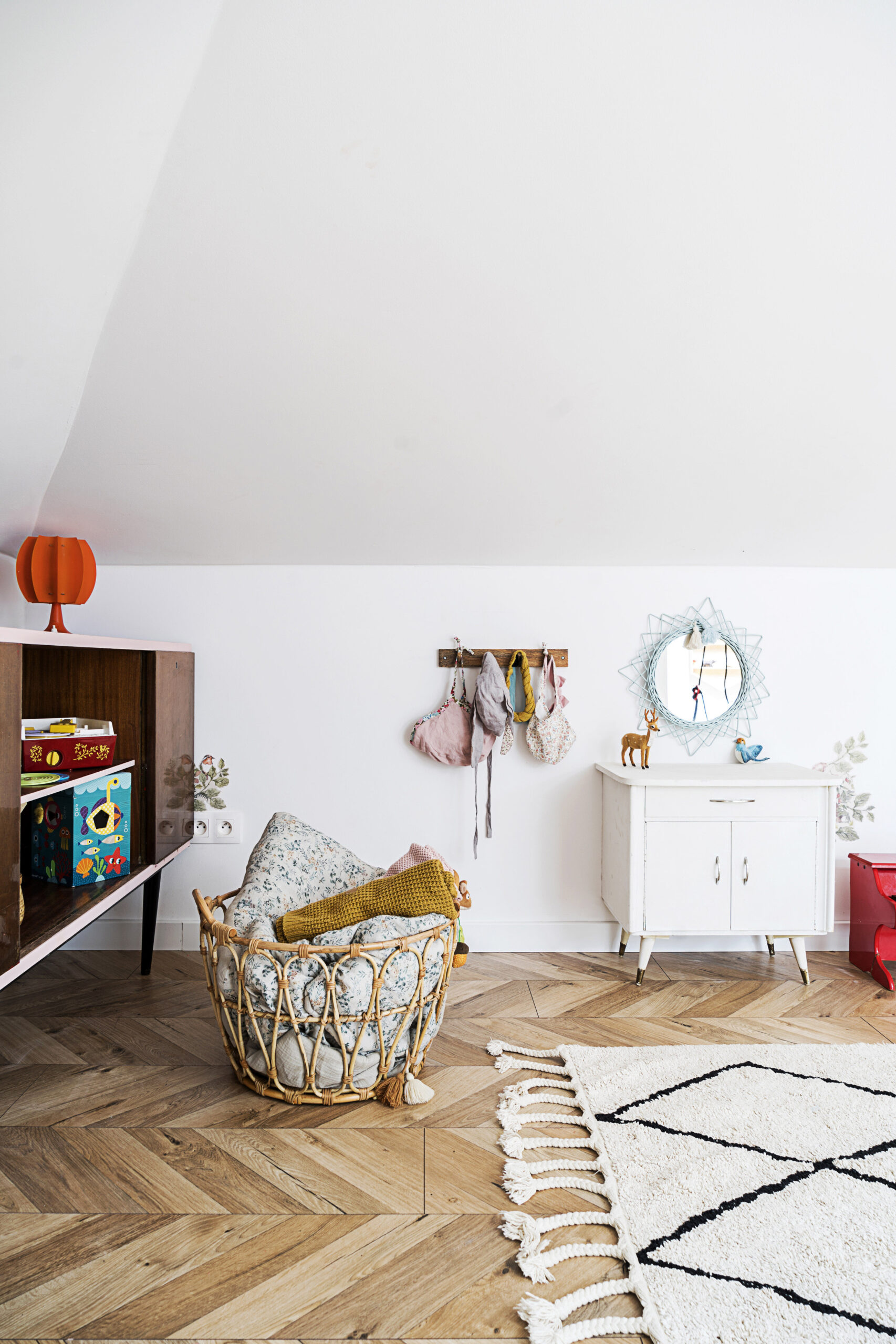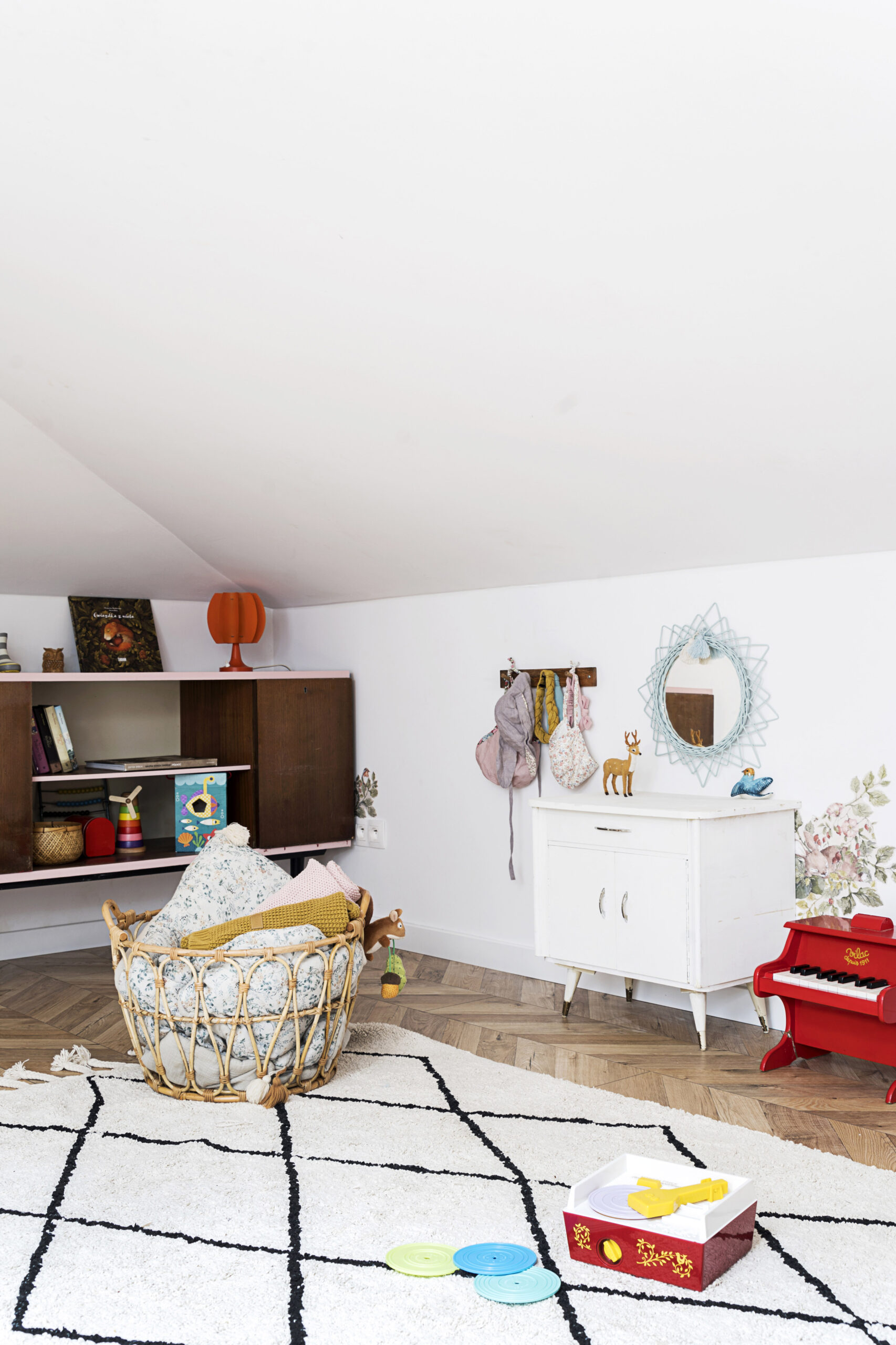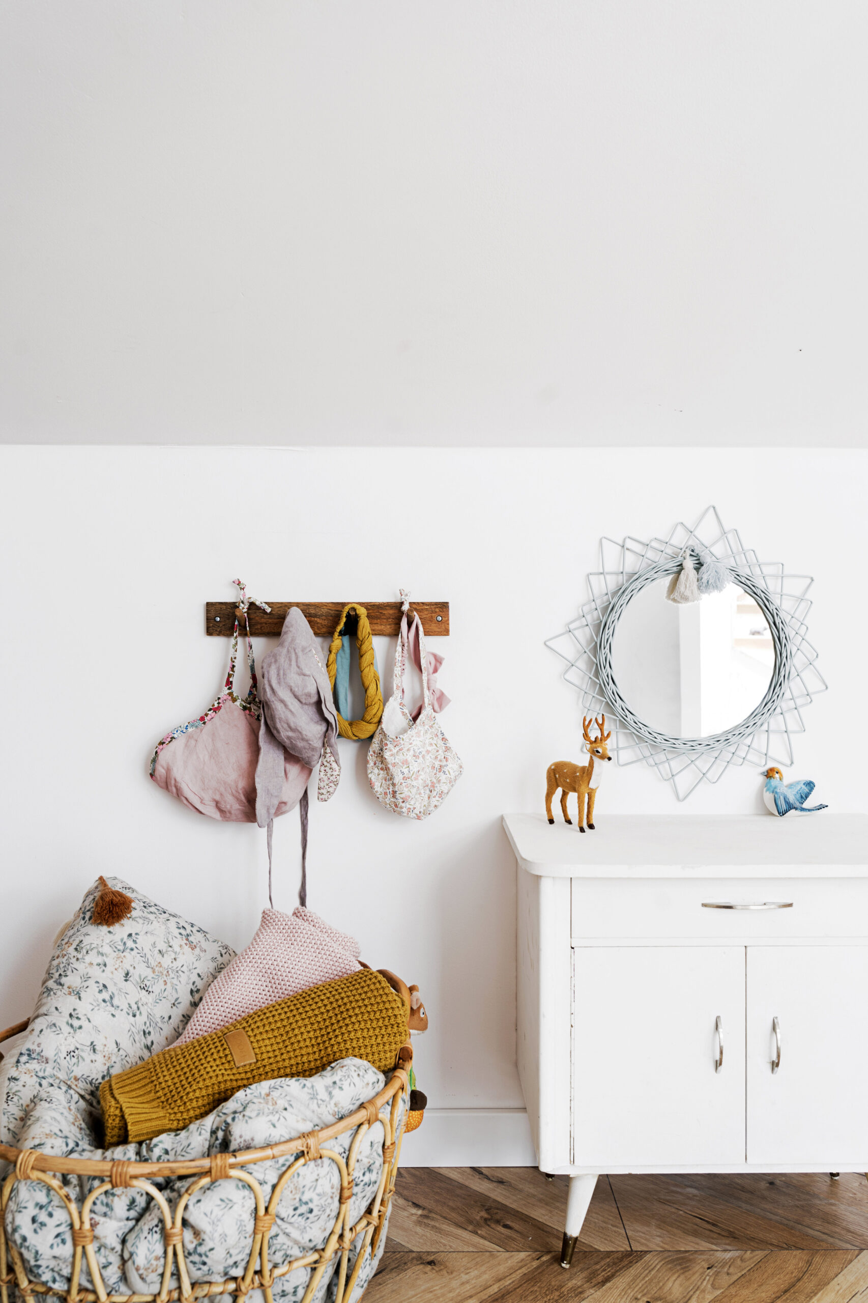 Rattanowy kosz, drewniany wieszak, wiklinowe lustro ścienne Lilu, zabawne doniczki i dywan, który można prać w pralce, to kilka drobiazgów, które ciepło wykańczają kącik Heleny. Monika ma też oko do pięknych zabawek: drewniane pianinko, szydełkowa grzechotka, żyrafa Sophie i myszki Maileg cieszą oko i małe rączki.