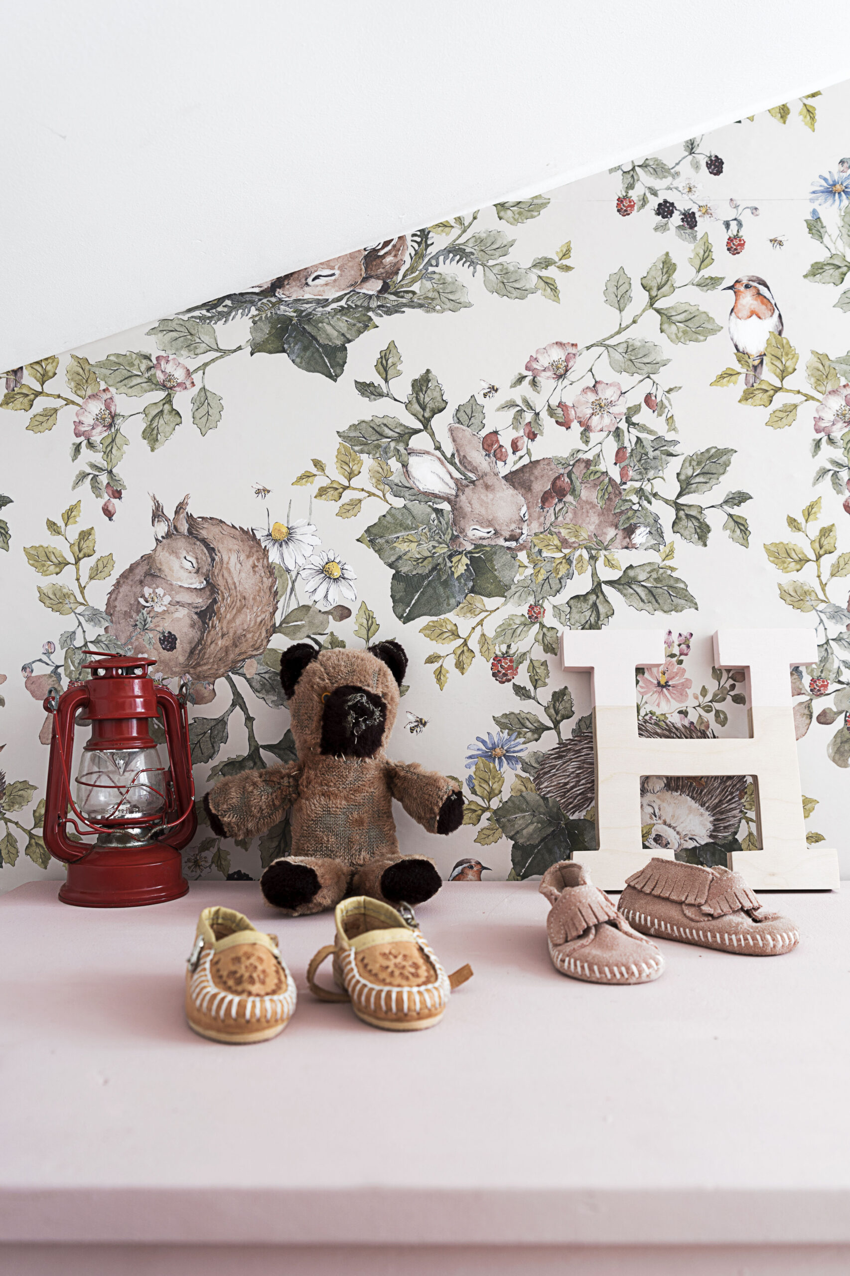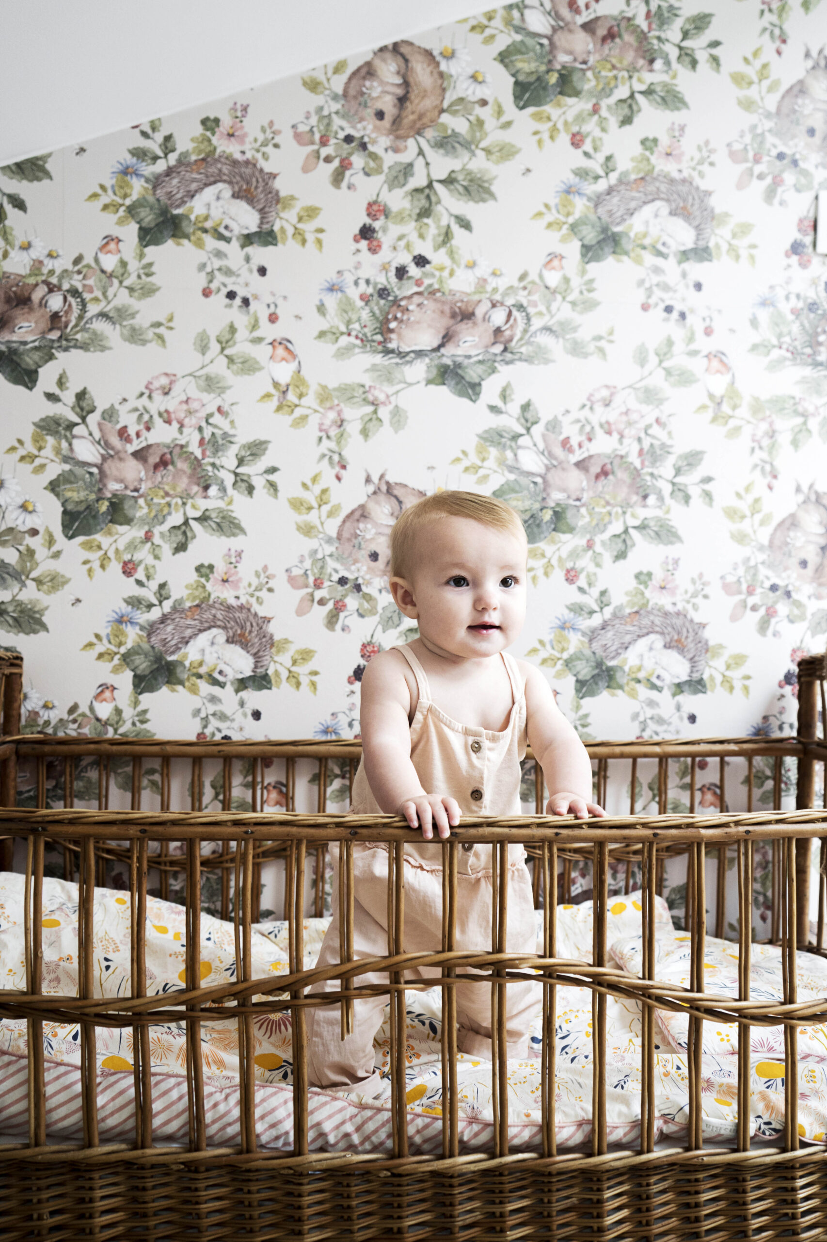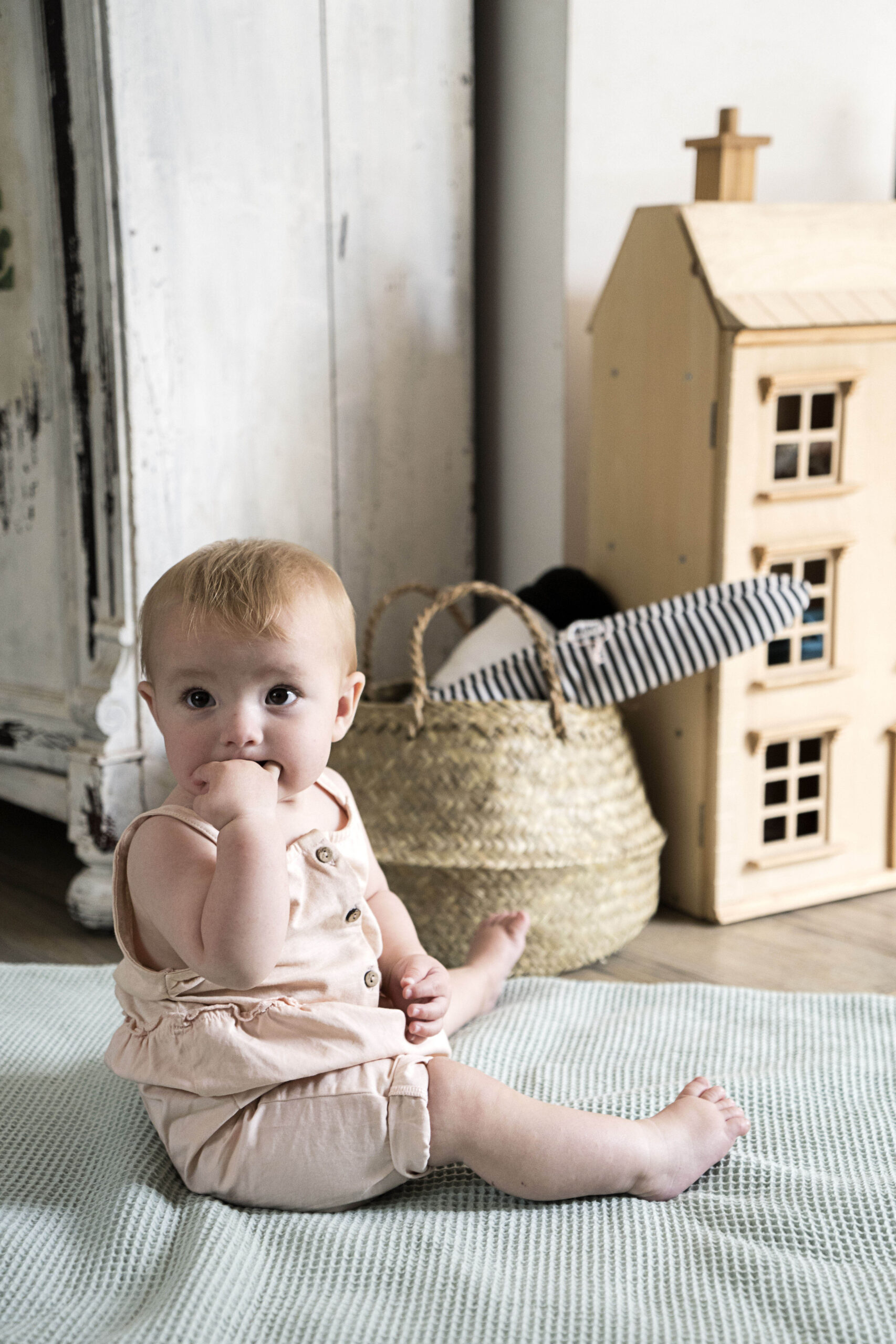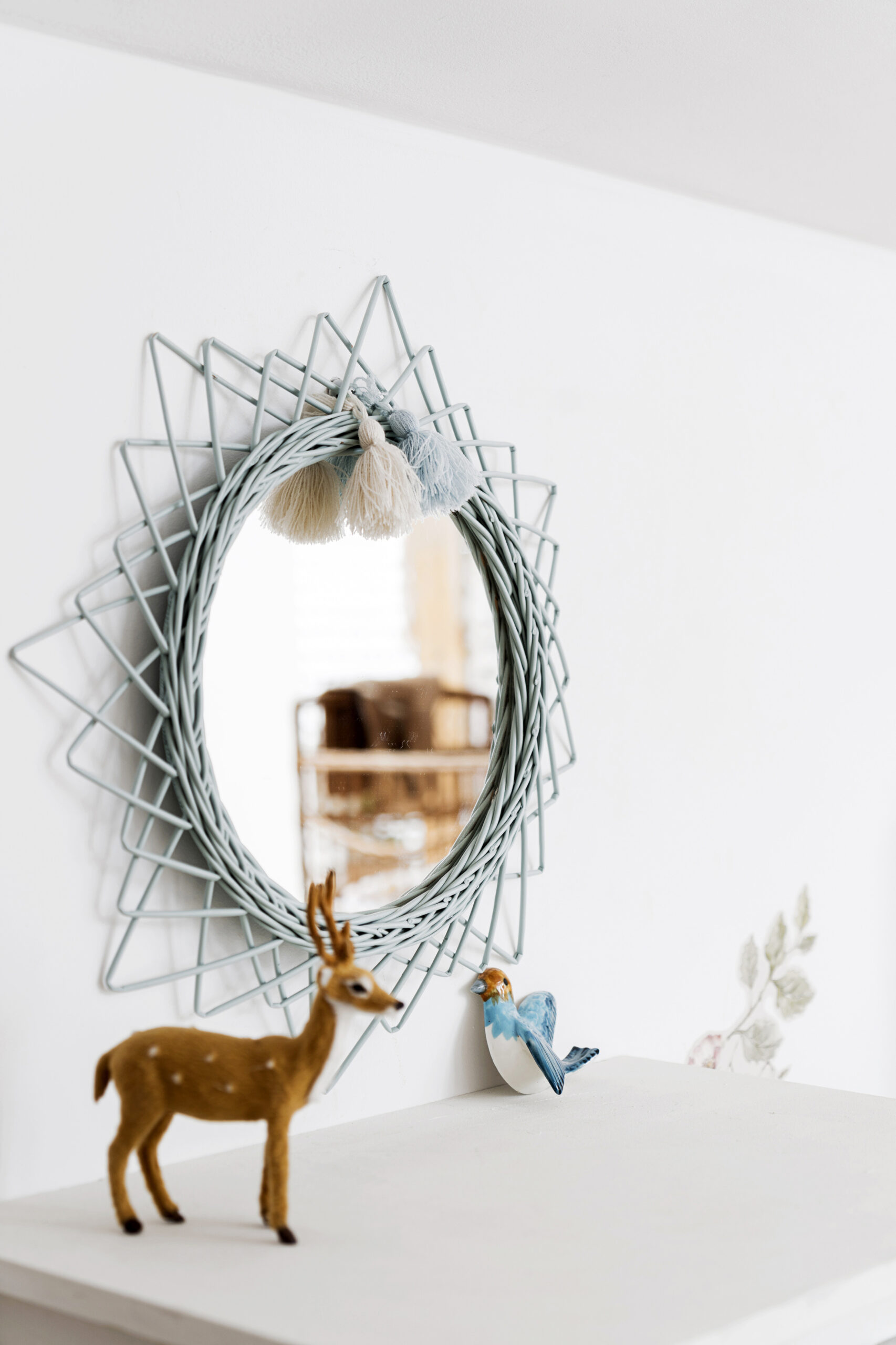 Rattanowy kosz, drewniany wieszak, wiklinowe lustro ścienne Lilu, zabawne doniczki i dywan, który można prać w pralce, to kilka drobiazgów, które ciepło wykańczają kącik Heleny. Monika ma też oko do pięknych zabawek: drewniane pianinko, szydełkowa grzechotka, żyrafa Sophie i myszki Maileg cieszą oko i małe rączki.
