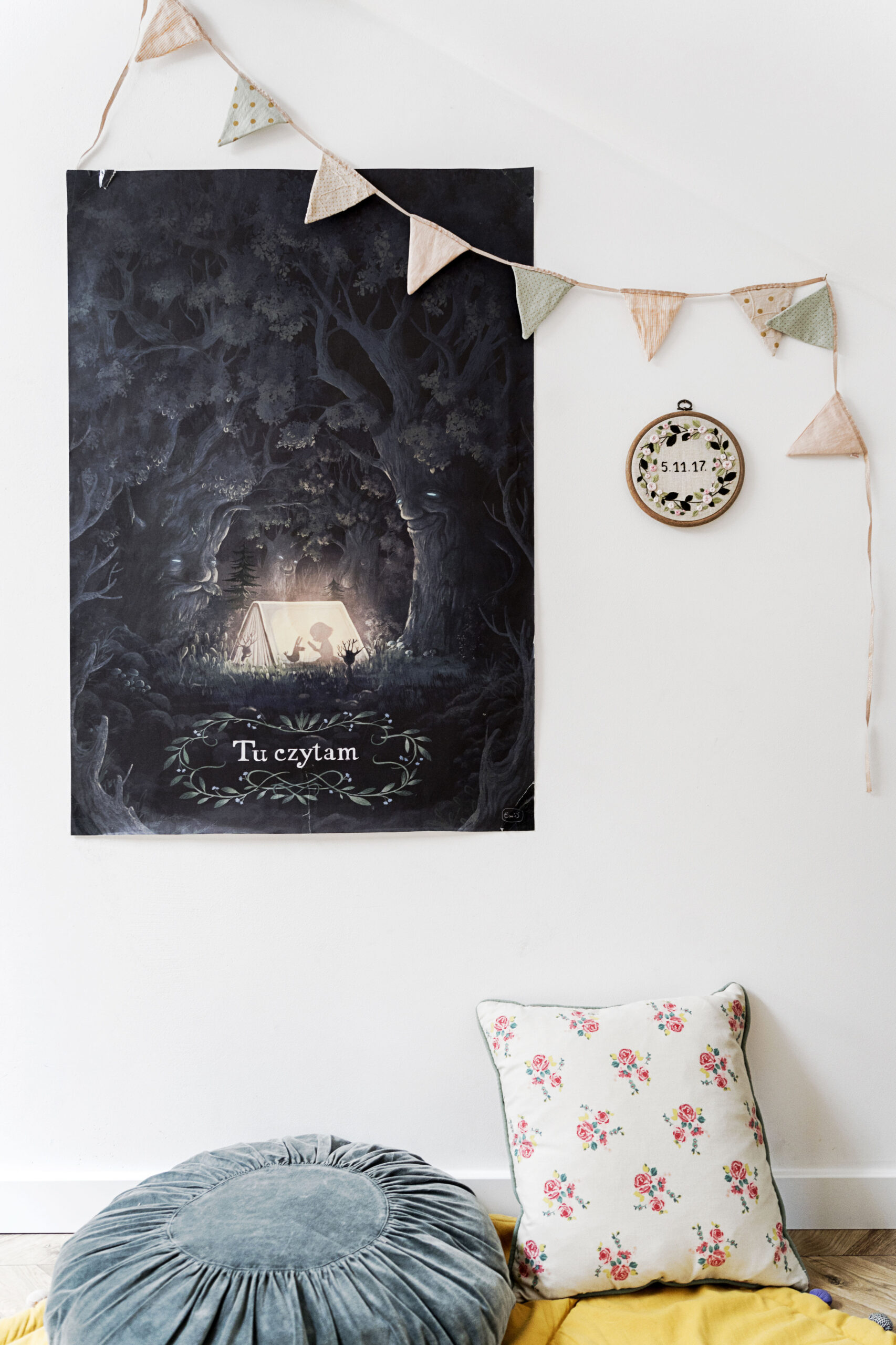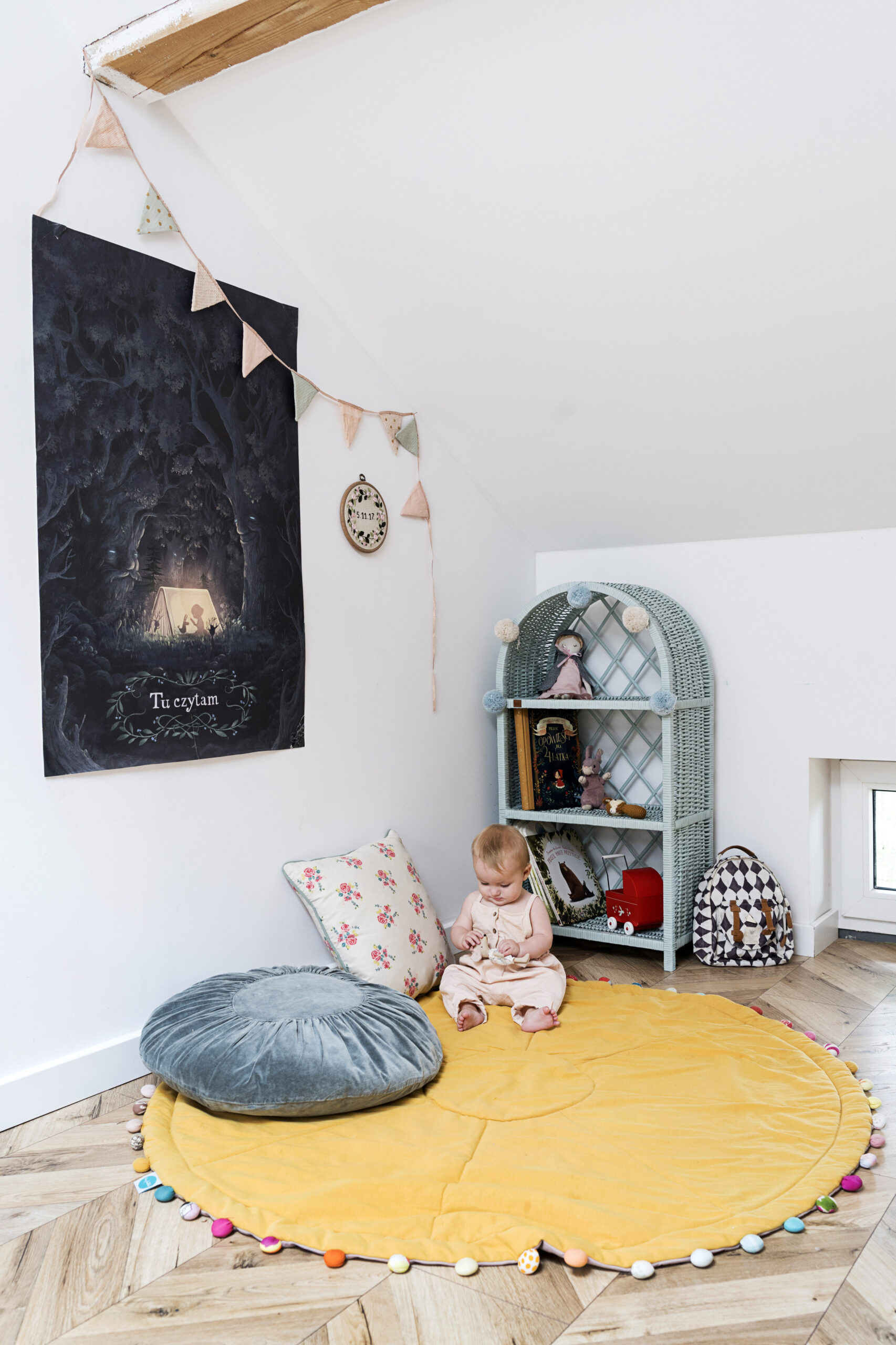 Dodatków w pokoju Helenki jeszcze nie ma za wiele, bo Monika czeka, aż mała sama zacznie się określać i wybierać to, co jej się podoba. A to, co jest teraz, to miks starych rzeczy wyszukiwanych na pchlich targach, zabawek po chłopcach oraz kilku perełek takich jak girlanda Maileg, okrągła poduszka aksamitna Madam Stoltz czy drewniana literka H. Dodatkowego uroku dodają tu tekstylia: kocyki – miętowy, musztardowy i różowy, poduchy muślinowe – mała i duża plus mata do zabawy z bąbelkami, które chłopcy namiętnie Helence podbierają. Jak widać, wszyscy lubią, kiedy jest przytulnie.
