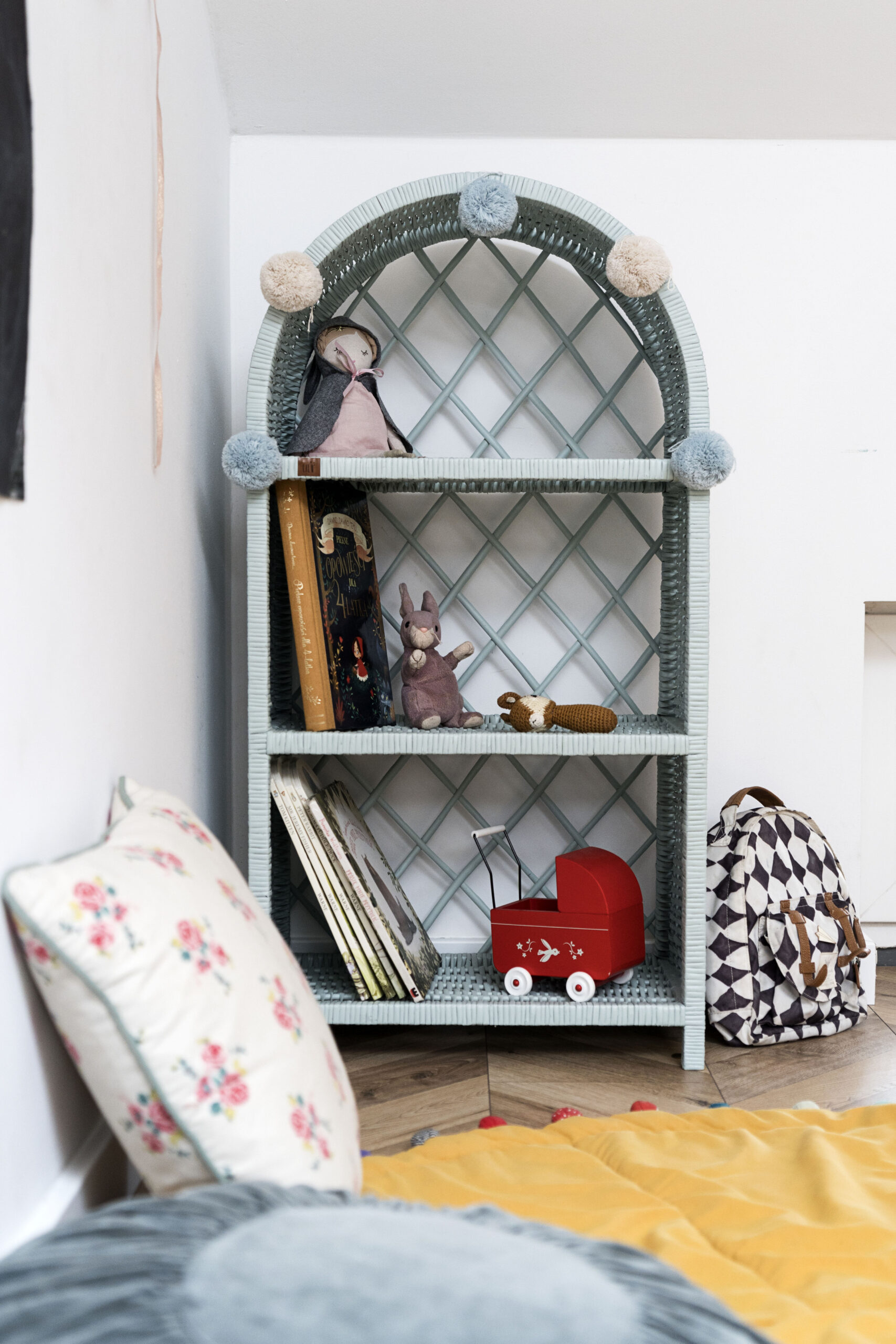 Żeby nie było tylko różowo, a wiadomo – z czasem tego różu tylko przybywa, do pokoiku wprowadziłam elementy brudnej mięty, którą wręcz ubóstwiam, a która bardzo fajnie spaja cześć Helenki z przestrzenią chłopców, którzy zaraz za ścianą z tapetą, mają swoje królestwo – dodaje Monika. I tak w pokoju Heleny pojawiła się piękna etażerka z Lilu w ulubionym kolorze mamy czy pasująca kolorystycznie delikatna muślinowa kołdra w gałązki.