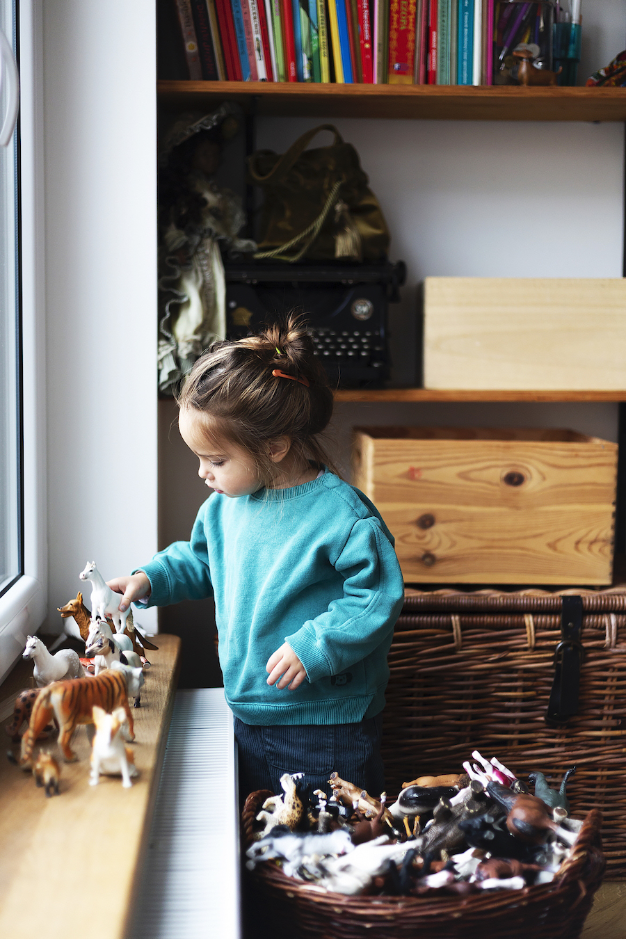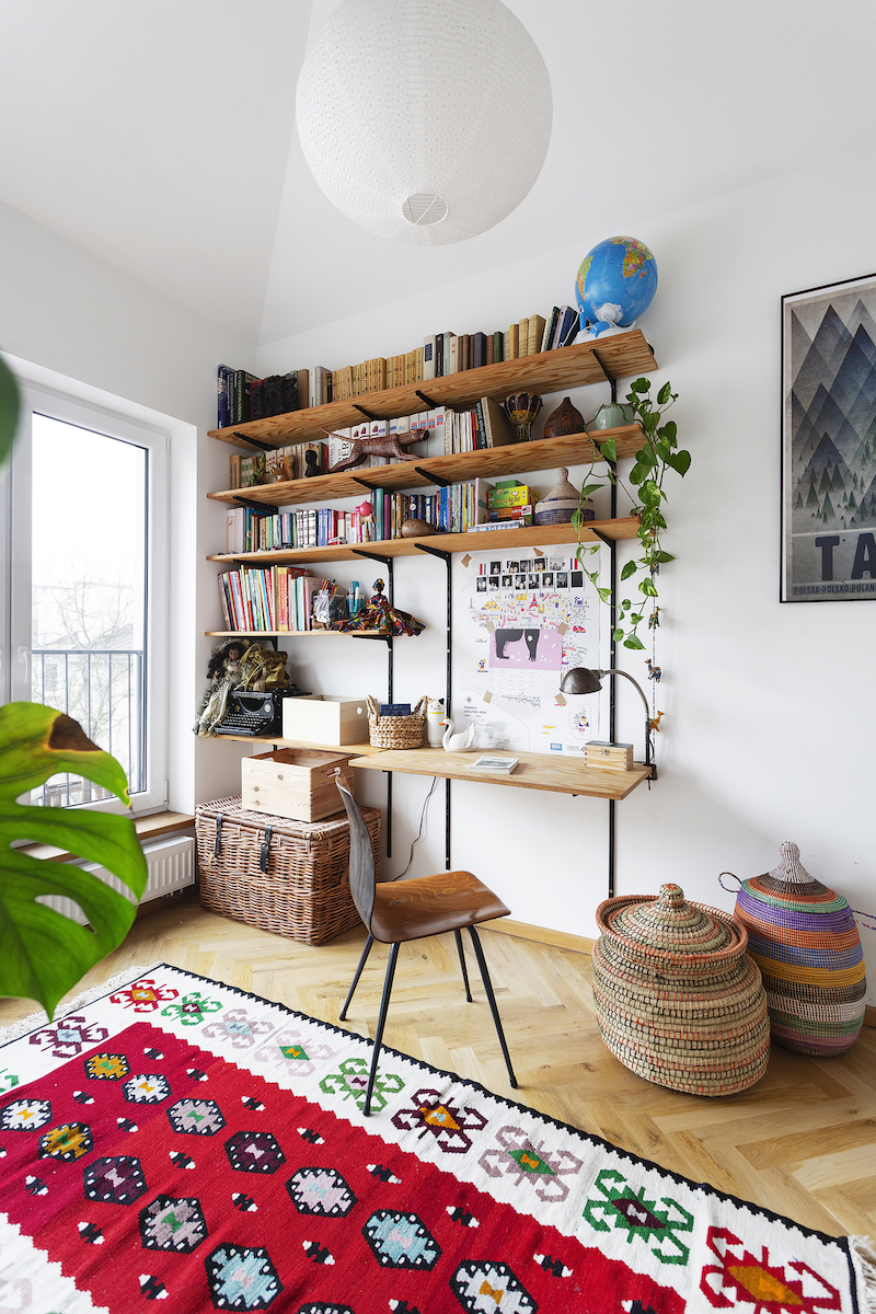 Helena to poważny młody człowiek, jak wyjaśnia jej mama: nie tylko z racji swojego „dorosłego” imienia, ale też tego, że przez bardzo długi czas wychowywałam ją samotnie – była bardziej moją partnerka życiową niż dzieckiem. Jest bardzo dojrzała i jak na swój wiek ma bardzo dorosłe zabawy, choć wciąż uwielbia bawić się figurkami zwierząt. Przedstawiciele fauny zerkają też z półek – to głównie pamiątki z podróży, jak drewniane zwierzątka z Kenii. Z dalekich krain jest też spora część dekoracji: darbuka, czyli barwny kielichowy bęben z Maroka i Algierii, koszyk-kobieta z Wysp Zielonego Przylądka, plecione kosze, dywan z Bośni – podobne wzorzyste dywany możecie upolować w Belabaet – i wygodna pufa z Maroka. To rękodzieło zgrabnie nawiązuje też do fascynacji Joasi, która przywozi wnętrzarskie perełki z podróży i sprzedaje w stworzonym z przyjaciółką Belabet, o którym pisałyśmy tutaj. A w tej całej kulturowej mozaice świetnie odnalazły się plakaty rodzimych twórców: „Tatry” Ryszarda Kai, dwa animalistyczne dzieła Dawida Ryskiego i ulubiony okaz Joasi z serii „cyrkowych” autorstwa Mariana Stachurskiego.