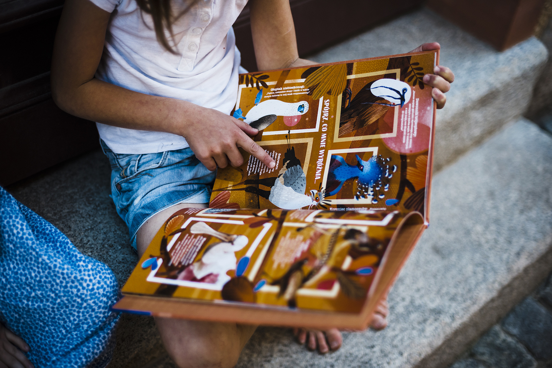 Ptaki żyją wszędzie, czytam na okładce książki, i dociera do mnie informacja, że mam oto w ręku pozycję, którą niezależnie od obranego kierunku wywczasu tego lata zabieramy ze sobą. W lesie, w mieście, w tropikach i mroźnych krajobrazach Antarktydy – no, tu nas raczej pingwiny nie zobaczą – wszędzie tam, przez lornetkę, albo tuż obok, w spokoju (!), po cichu i z entuzjazmem obserwować możemy życie niezwykłe. Dzięki oddającym urok poszczególnych gatunków ilustracjom autorki i ciekawostkom podanym w telegraficznym, zachęcającym do dalszego eksplorowanie tematu skrócie, dowiemy się, na kogo zerkamy, kogo słyszymy, lub czyje piórko będzie jedną z piękniejszych pamiątek z urlopu.
