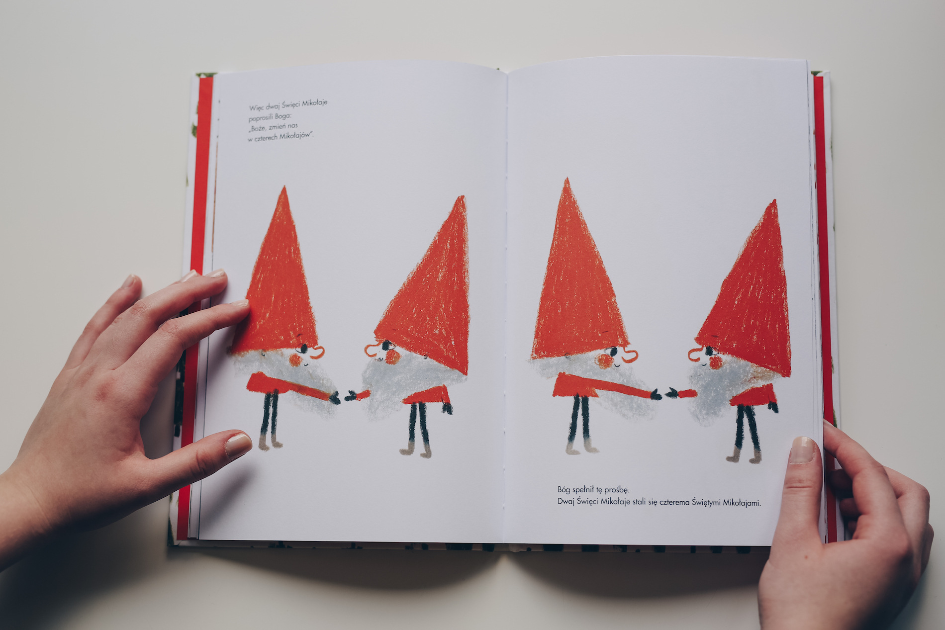 Przenieśmy się do czasów, gdy na świecie był tylko jeden Święty Mikołaj. Na całej Ziemi żyła wtedy zaledwie garstka dzieci. Można było je policzyć na palcach u jednej ręki. No dobra, dwóch rąk. Mikołaj nie miał najmniejszego problemu z dostarczaniem prezentów. Zawsze zatrzymywał się w odwiedzonych domach na ciepłą herbatkę i pogawędkę. Lecz z każdym grudniem dzieci przybywało. Przyjacielowi z długą brodą zaczęło brakować sił. Renifer także był wycieńczony i musiał robić przerwy na odpoczynek. Worek stawał się coraz cięższy. Święty Mikołaj bardzo pragnął, aby mógł się rozdwoić… I uwaga, udało się! Był tylko jeden problem. Otóż nasi dwaj Mikołajowie byli o połowę mniejsi i wkrótce im także zaczęło brakować sił. Jak rozwiązali ten problem? Tego wam nie zdradzę. „Milion miliardów Świętych Mikołajów” to błyskotliwa i nieco wzruszająca książka o tym, jak to w końcu jest z tym sympatycznym panem w czerwonym stroju. Hiroko Motai oraz Marika Maijala, autorki tekstu i ilustracji, świetnie podeszły do tego tematu. Ich nieszablonowy pomysł skradł moje serce. Z waszymi serduchami pewnie będzie tak samo!