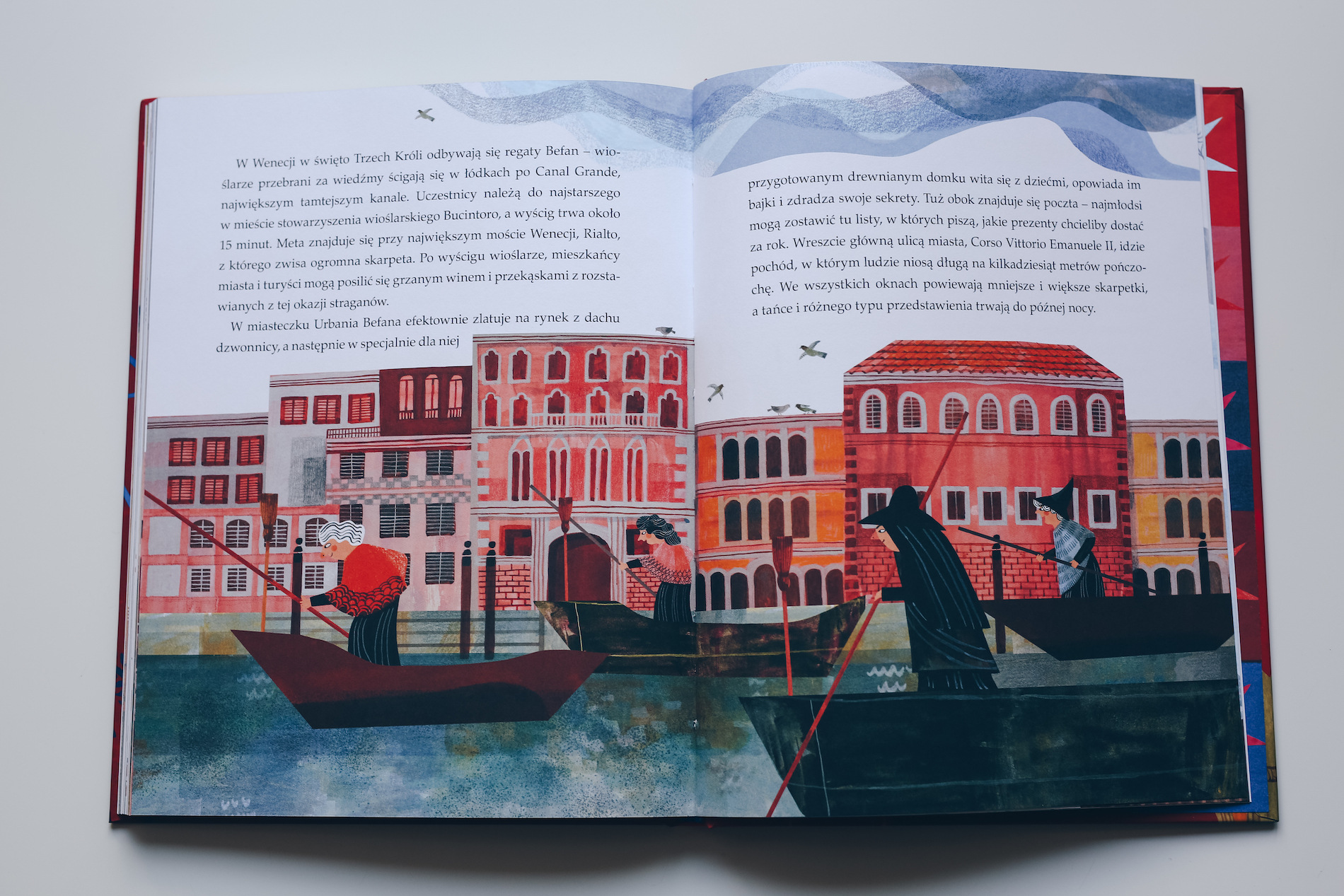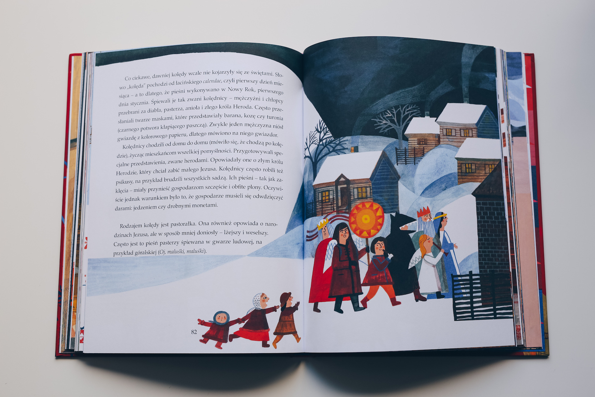 Pozwólcie, że zabiorę was w podróż. Wyobraźmy sobie, że jest 24 grudnia. Rodziny narzucają już obrusy na stoły i układają na nich przygotowane wcześniej potrawy. Uwaga, użyjemy teraz magii książek i przeniesiemy się na Ukrainę, Litwę i do Rosji oraz do Polski – jednocześnie. Bardzo możliwe, że na wigilijnym stole dostrzeżemy kutię. Kutia to z greckiego kokkos, czyli ziarnko, pestka. Zapewne wiecie, że powstaje ona z pszenicy, maku, rodzynek, orzechów oraz miodu. Zajrzyjmy teraz do Szwecji. Pokusa Janssona jest szwedzką zapiekanką z ziemniaków, cebuli i szprotek. Natomiast glögg to grzane wino ze skórką pomarańczy, cynamonem, kardamonem, goździkami i imbirem. Istnieje również wersja bezalkoholowa – owocowa lub czekoladowa! Wiecie może, w jaki sposób powstała pierwsza na świecie bombka? Niegdyś choinkę przystrajano jabłkami, orzechami i słodyczami. Wystarczyło sięgnąć ręką i już łakocie lądowały najpierw w buzi, a później w brzuchu. Jednak nie wszystkie rodziny było stać na zakupienie takich pyszności, niestety. Bieda panowała między innymi w niemieckim miasteczku Lauscha. Skromny pracownik miejscowej huty, chcąc uszczęśliwić swoje dzieci, wpadł na pomysł, by z pomocą rozgrzanej do czerwoności szklanej rurki wydmuchał owoce ze szkła. Radosnych podskoków (najpierw dzieci, a później całego świata) nie było końca. Jestem ciekawa, czy znacie adres Świętego Mikołaja i wiecie, kiedy wypada grudniowe prima aprilis… Jeśli nie, z prędkością światła musicie zdobyć przepiękną książkę „Idą święta! O Bożym Narodzeniu, Mikołaju i tradycjach świątecznych na świecie”. Jestem przekonana, że przypadnie do gustu zarówno młodszym czytelnikom, jak i wam (dorosłym – przyp.red.).