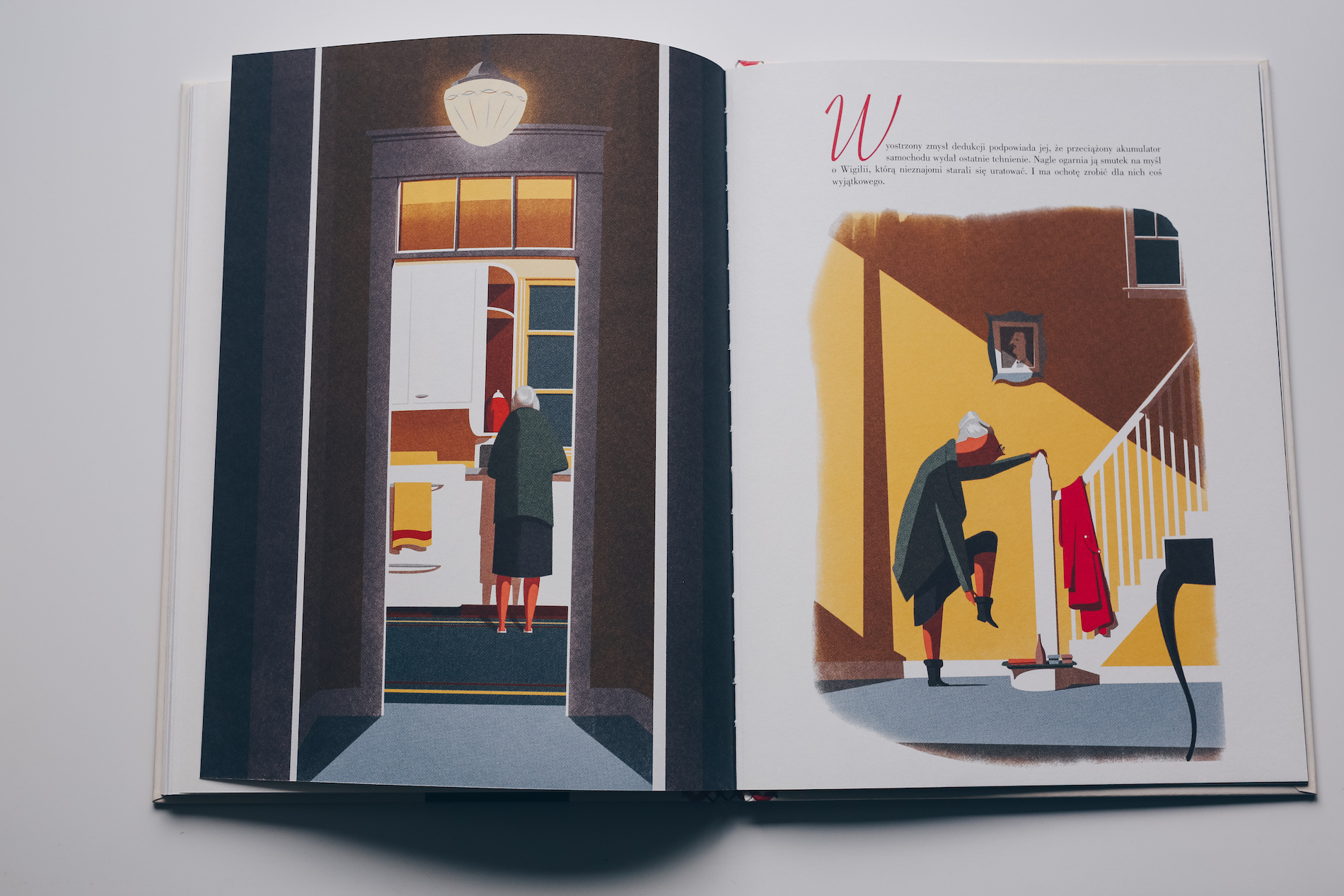 Dobrze, zmieńmy teraz klimat z radosnego na nieco refleksyjny. Wigilia zazwyczaj kojarzy się nam z rodzinnymi rozmowami, lekkim chaosem i wizją o wylaniu barszczu na biały obrus. Jednak Wigilia Małgorzaty Goden wygląda zupełnie inaczej. Małgorzata to kobieta w podeszłym wieku. Jest zadowolona z tego, że nie musi wyściubiać nosa z domu. Kilka lat temu udekorowała swoje mieszkanko najlepiej, jak umiała. Powiesiła stroik bożonarodzeniowy. Straszliwie ją to wykończyło. Dlatego postanowiła, że już nigdy go nie zdejmie. Teraz stroik wisi w oknie przez cały rok, a na Święta Małgorzata zapala tylko lampki. Jej dzieci i wnuki chciałyby spędzić Wigilię ze swoją mamą i babcią, ale Małgorzata zawsze im powtarza, żeby sobie odpoczęli i dobrze się bawili. Kiedyś spędzała Święta z całą swoją rodziną – przygotowywała w kuchni różne smakołyki, a jej daniem popisowym było ciasto czekoladowe. Potem zaczęły jej drżeć dłonie, więc porzuciła gotowanie. Teraz każdą Wigilię spędza przed telewizorem. Czasami urozmaici sobie wieczór podglądaniem sąsiadów. Ale ileż można tak wytrzymać? Książka „Wigilia Małgorzaty” z pewnością skłoni was do refleksji. Będzie także powodem do rozmowy o starości oraz samotności. Na zachętę dodam, że czyhają w niej znakomite ilustracje, które zostały docenione najbardziej prestiżową nagrodą w Bolonii.