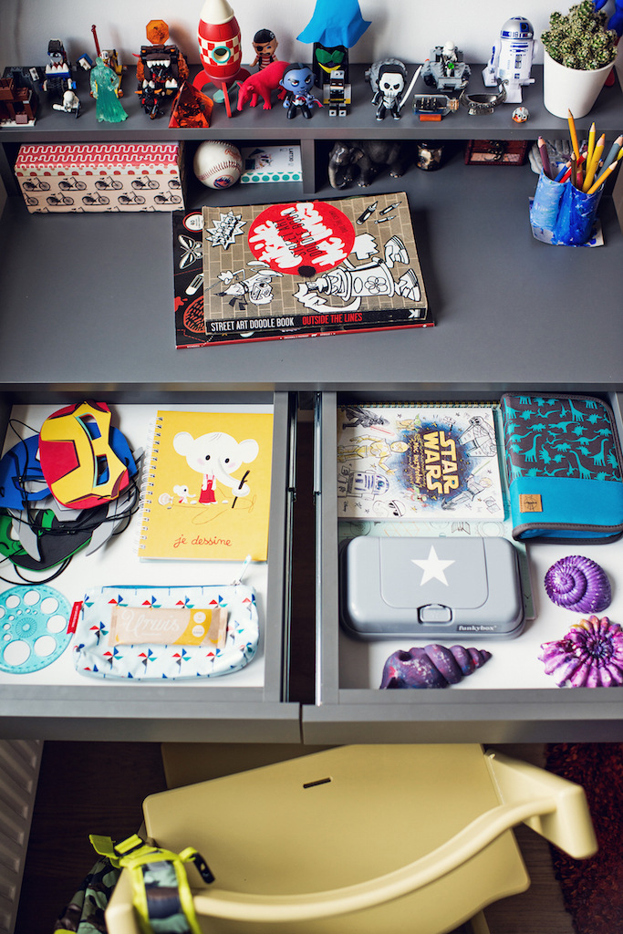 Biurko to teraz drugie ulubione miejsce w pokoju małego chłopca, który wygląda jakby urwał się z Bullerbyn. Ustawia na nim swoje figurki, ugly toysy i nowe kredki, zeszyty i kolorowanki.