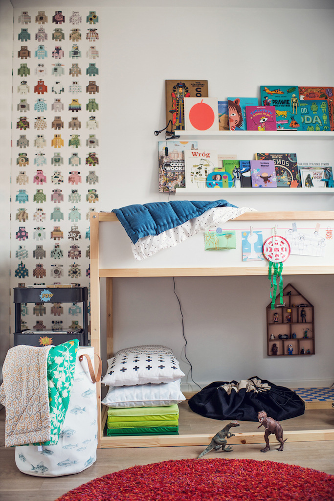 Jaś lubi się gdzieś schować i na szczęście rodzice spełnili jego marzenie: łóżko piętrowe IKEA Kura, a pod nim miejsce na poduchy, rozłożenie materaca (hit! do robienia fikołków) i ukrycie ważnych akcesoriów takich jak deskorolka.