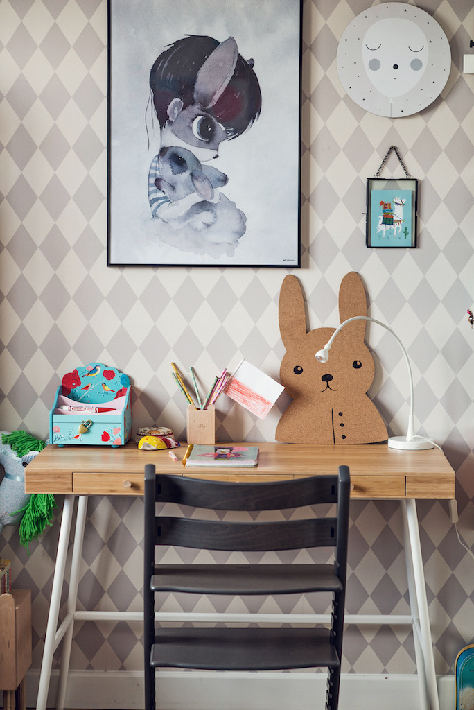 biurko IKEA / krzesło Stokke / półki na książki IKEA / plakat Mukaki / okrągły plakat HEI / korkowy królik / pudełka IKEA / walizeczka Santoro /