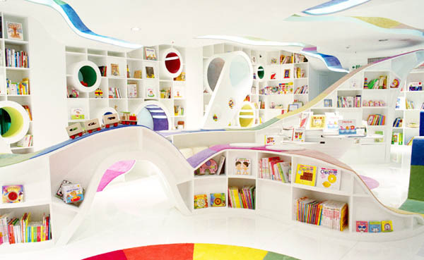 Made in China, to jedno, a designed in China, to drugie. Ta niesamowita przestrzeń, to księgarnia w Beijing i mamy wrażenie, że na całym świcie nie znajdziemy lepszej. Jej każdy kąt cieszy się z wizyty małych czytelników i szczerze zaprasza na spotkanie z książką. Przyjazna kolorystyka pozwala poczuć się bezpiecznie i motywuje do podążania tropem regałów, a intrygujące zakamarki obiecują wspaniałą zabawę. Ten, kto uważa, że czytanie jest tylko serio, powinien koniecznie odwiedzić ten sklep.