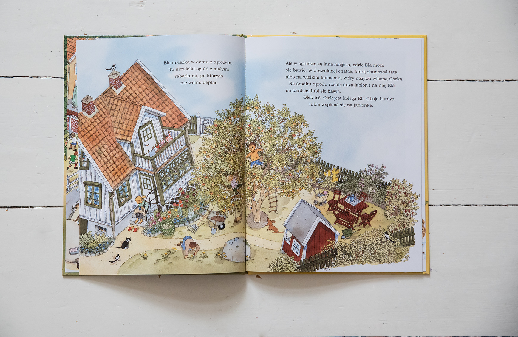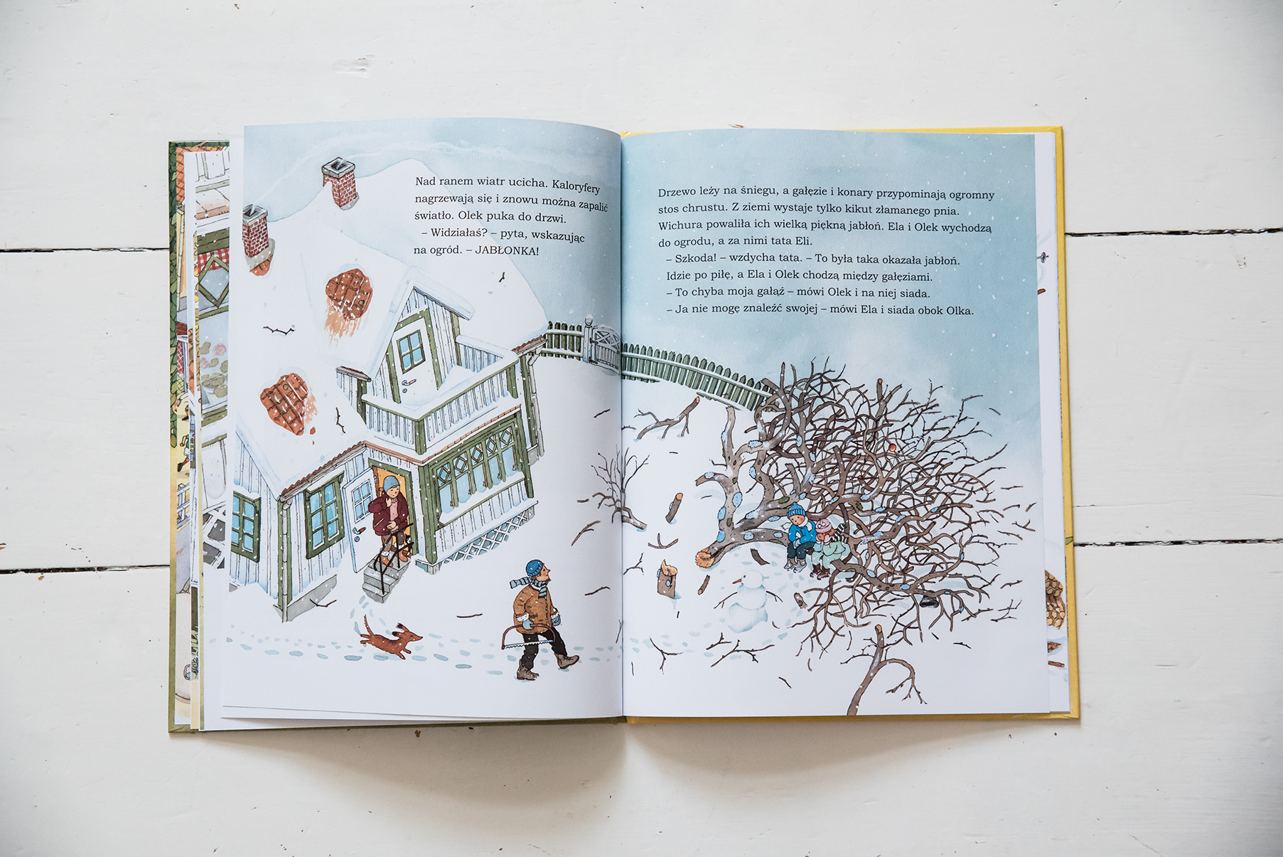 Z „Jabłonką Eli” jest trochę jak z serią o Mamoko czy ulicy Czereśniowej – hit, po prostu. Wciąga to jak bagienne podłoże, tylko milej, bo ciepło i sucho jest nam usadowionym na kanapie, kiedy Olkowi, Eli i jej rodzicom zimno zimą i mokro jesienią. Wszystko toczy się wokół jabłonki, którą połamała wichura i której korzenie trzeba było wykopać z ziemi – taką miała chęć do życia! Dzieciom robi się smutno na myśl o tym, że nie schrupią jesienią jabłka prosto z drzewa, dlatego mama organizuje wyprawę po nowe drzewko – mizerne takie i chude w porównaniu ze starą, kochaną, wieloletnią jabłonką. Ale chociaż młode, obrodzi soczystym jabłuszkiem, które podzielone zostanie na cztery równe kawałki. Starczy dla wszystkich.