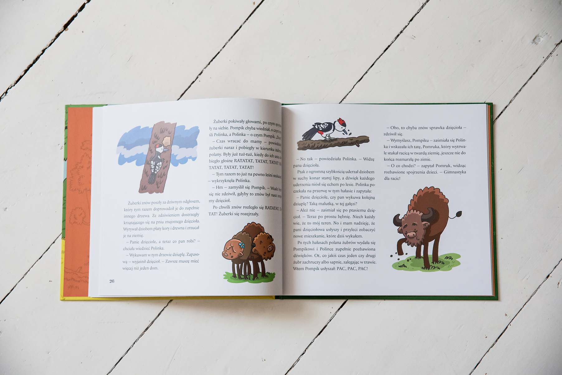 W wiosennej odsłonie przygód żubra Pompika pojawia się nowy bohater, a raczej bohaterka – siostra Polinka, która niedawno się urodziła i chce wraz z bratem poznawać świat. To się dobrze składa, bo Pompik ma w sobie ciekawość, której pozazdrościłby mu sam Indiana Jones. Z wielką radością obserwuje pojawiające się na drzewach liście i kwitnące na łąkach kwiaty. Pompik i Polinka zaprzyjaźniają się z wiewiórką, której gniazdo spadło z gałęzi, i podpatrują sunącego po wodzie raka. Tyle się dzieje!