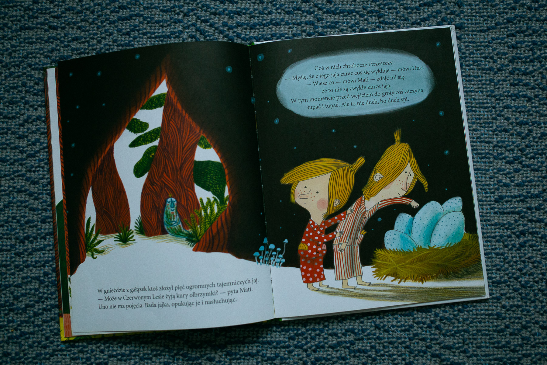 Mati, Uno i Humbaba wparowali na pierwsze miejsce Jaśkowego rankingu i bezwzględnie je okupują, do odwołania. Przygody dwóch braci, którzy wracają z targu staroci z tajemniczą niebieską butelką, w której uwięziony jest duch cedrowego lasu, to ulubiona lektura najmłodszego syna Anuli i Dawida: Ta pozycja jak bumerang wraca do nas z bibliotecznej półki. Duchy, pająki i czarownice okupują top listę naszego rozczochranego 4-latka. „Duch z butelki” z ilustracjami Benjamina Chauda towarzyszy nam każdego wieczoru, a zaklęcie „Anzu! Aruru! Apsu!” działa już w naszym domu. Fajne jest to, że chłopaki bezbłędnie rozpoznają ilustracje Chauda, głównie za sprawą serii książek o słoniu Pomelo – kontynuuje Dawid. A ja przypominam przy okazji link do wywiadu z tym francuskim ilustratorem.
