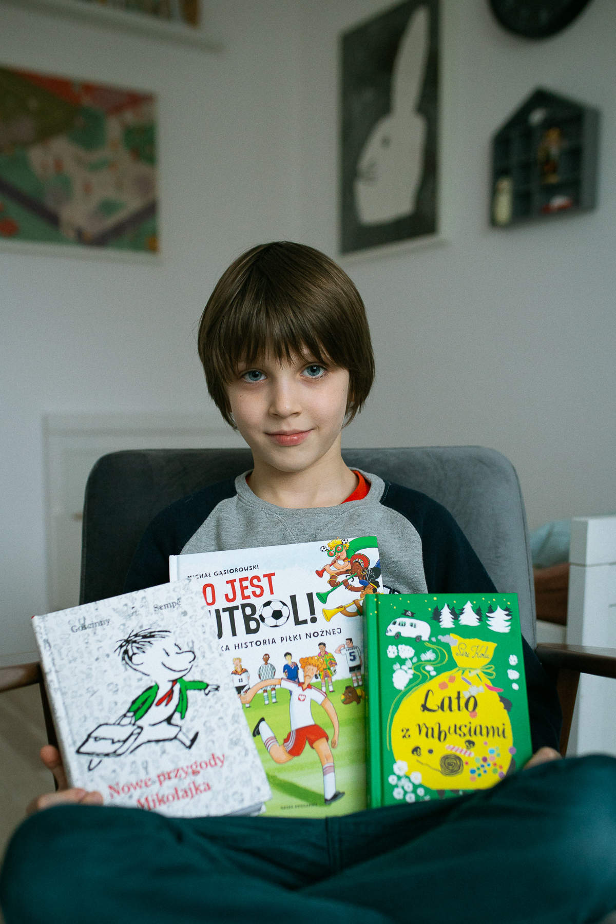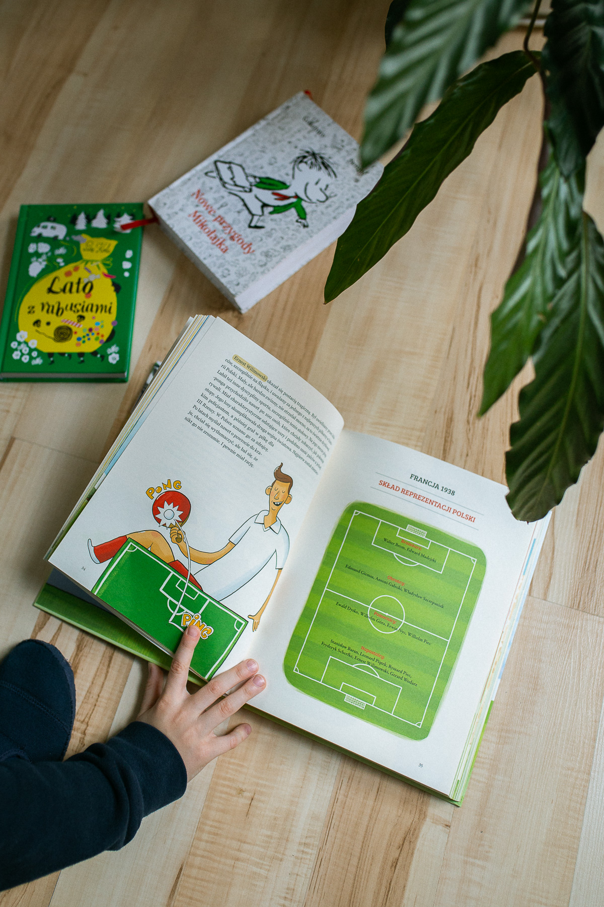 Seria o Mikołajku to zdecydowanie numer jeden na Frankowej liście książkowej. Wszystkie części. Najpierw czytane przez nas, teraz w formie audiobooków czytanych przez Macieja i Jerzego Stuhrów. Niemal co wieczór je odświeżamy – opowiadają o literackich wzlotach syna jego uważni rodzice. „Nowe przygody Mikołajka” Franek czyta na okrągło, nie mogąc się oderwać od wartkich opisów przygód, wpadek i tarapatów, w jakie wpadają tytułowy bohater wraz z Euzebiuszem, Alcestem i Gotfrydem. A kiedy Frankowi doskwiera niedobór literatury przygodowej, sięga po „Lato z rabusiami” Siri Kolu z ilustracjami Tuuli Juuseli. Dawid umieściłby tę książkę na półce z literaturą dziecięcą „z dreszczykiem”. Ciekawe, że ze zwykłych rodzinnych wakacji może wyniknąć tak wiele intryg, niewiadomych i tyle rabusiowania. Kolejnym hitem Frankowej biblioteki jest pozycja pt. „To jest futbol!” – jak mówią rodzice: Piłkarskie publikacje są ostatnio zdecydowanie najchętniej studiowane przez Franka. Wynika to z jego ogromnego zainteresowania tematem. W książce Michała Gąsiorowskiego z ilustracjami rysowniczej rodziny Surmów: Agnieszki, Przemka i 10-letniej Malwinki, znajdziecie pełną historię piłki nożnej wraz z ciekawostkami, frapującymi zarówno wielbicieli futbolu, jak i sceptyków i żółtodziobów.