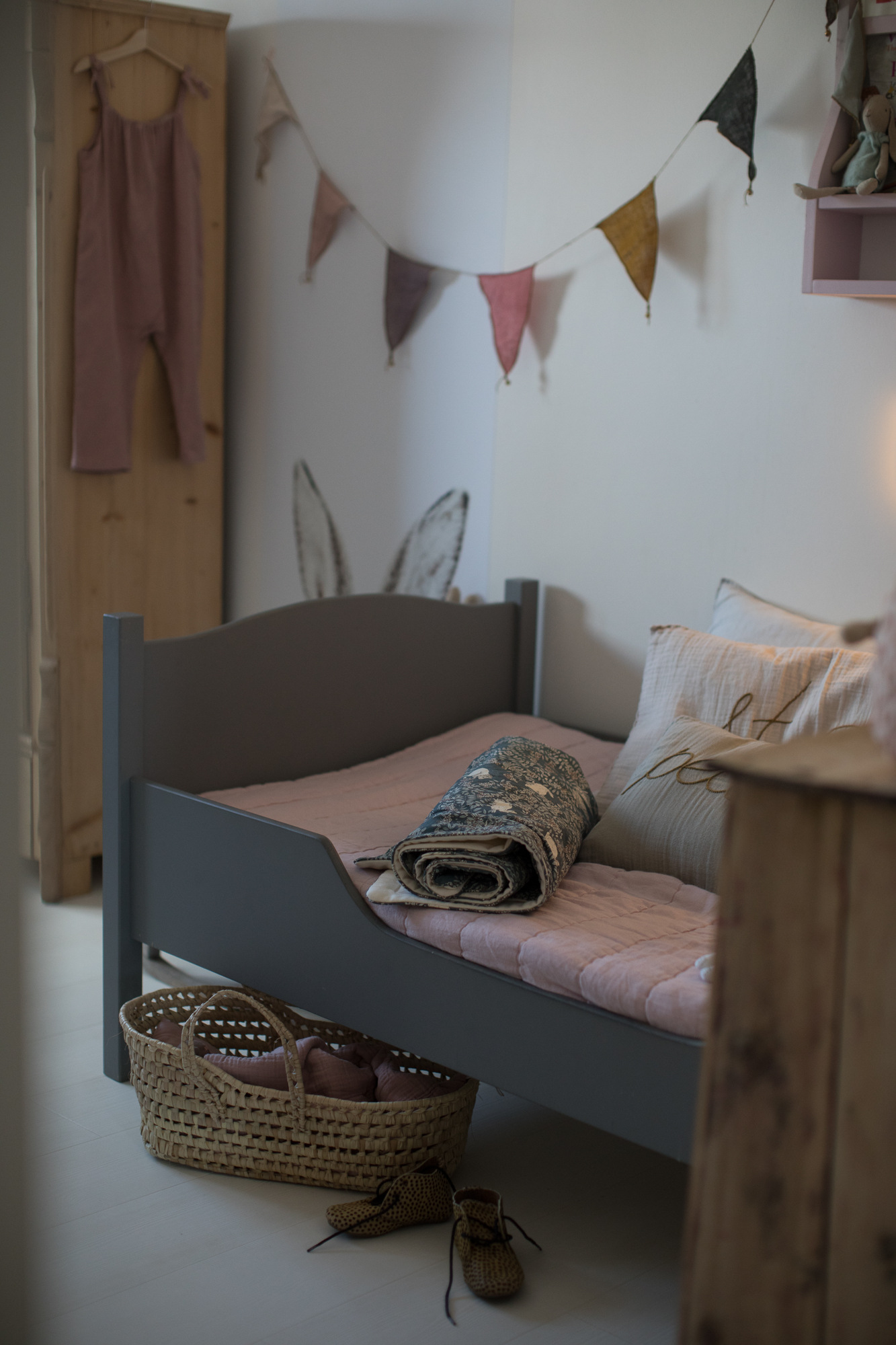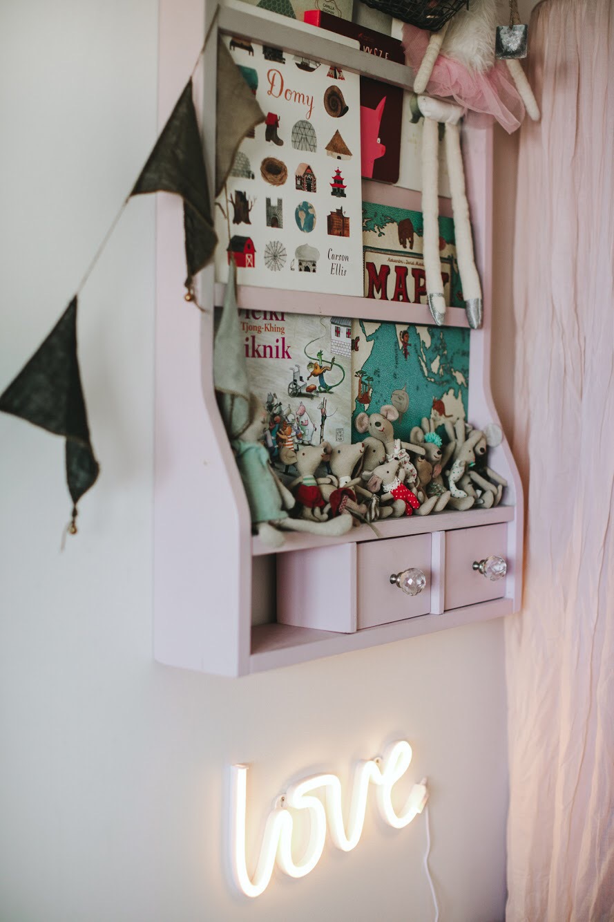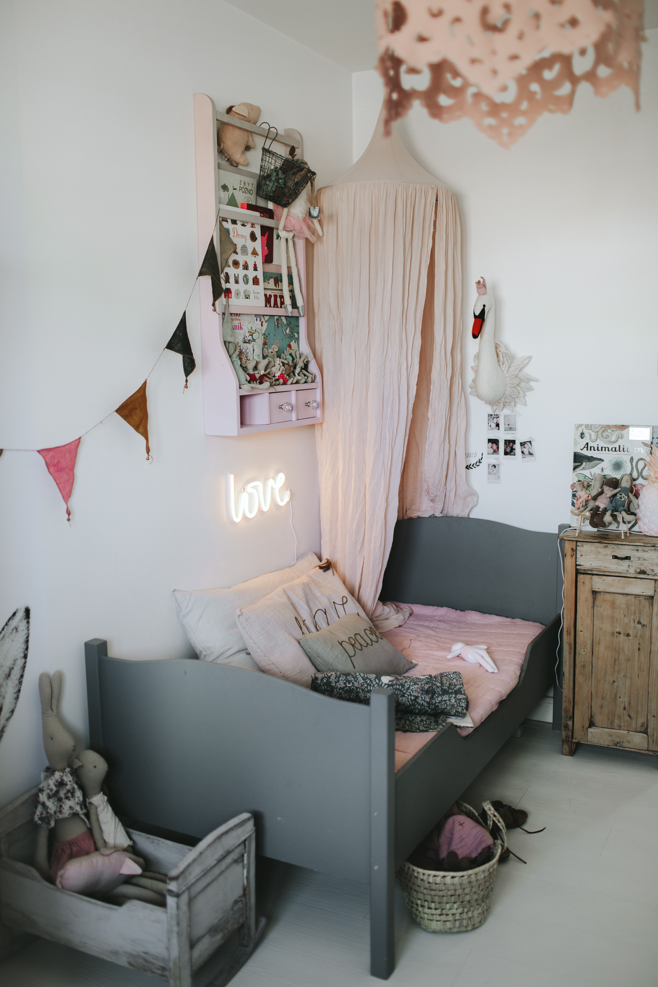 Pokój Mii to królestwo pasteli, delikatnych wzorów, naturalnych tkanin i drewnianych mebli. Muślinowy baldachim sąsiaduje z girlandą i zdobiącym ścianę polaroidów łabędziem. Dziewczęcą przestrzeń rozświetla lampka ananas oraz neon. Pokaźna kolekcja myszek i królików Maileg usadowiła się wygodnie na bladoróżowej półce, a reszta zabawek spoczywa w plecionych koszach. I jest porządek.