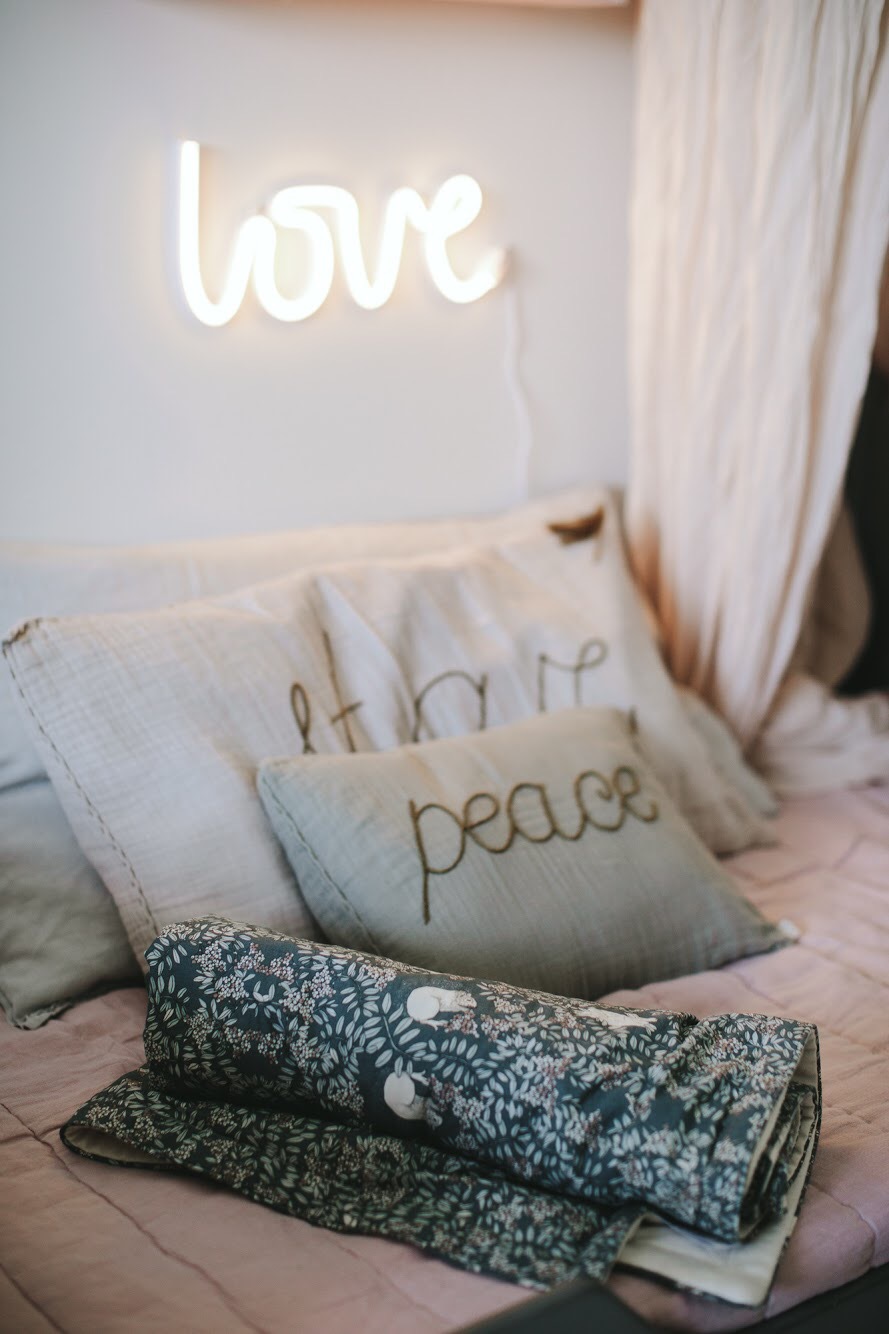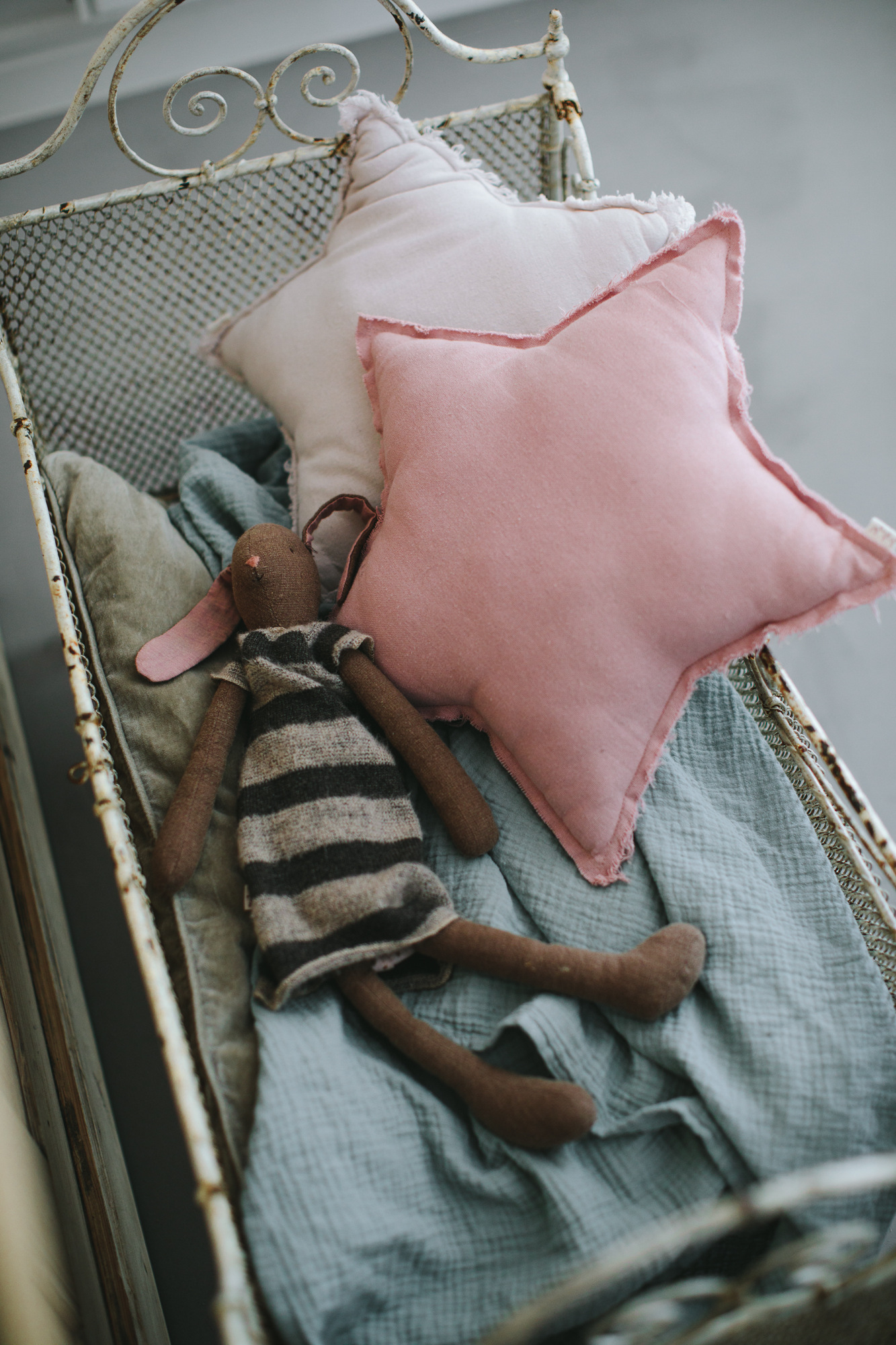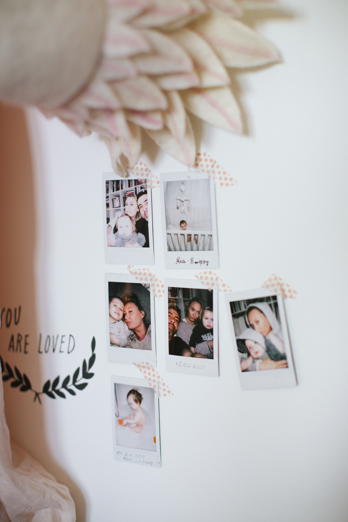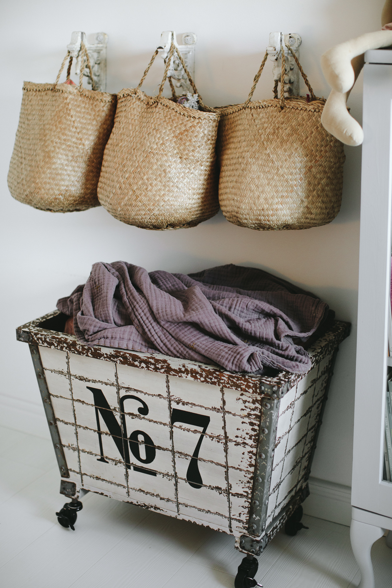 Pokój Mii to królestwo pasteli, delikatnych wzorów, naturalnych tkanin i drewnianych mebli. Muślinowy baldachim sąsiaduje z girlandą i zdobiącym ścianę polaroidów łabędziem. Dziewczęcą przestrzeń rozświetla lampka ananas oraz neon. Pokaźna kolekcja myszek i królików Maileg usadowiła się wygodnie na bladoróżowej półce, a reszta zabawek spoczywa w plecionych koszach. I jest porządek.