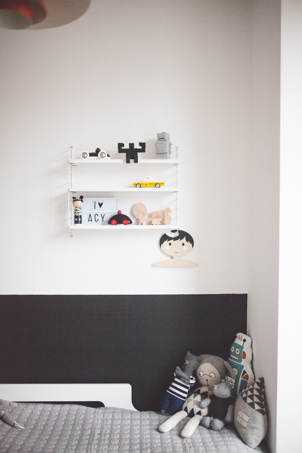 Kultowy szwedzki String, czyli półki, które wiszą w wielu nie tylko skandynawskich domach to świetny pomysł na wyeksponowanie niektórych dodających pokojowi uroku bibelotów i zabawek. Uroczy wieszak w kształcie głowy chłopca czy laleczka kokeshi oczywiście drewniane, podkreślają minimalistyczną estetykę domu.