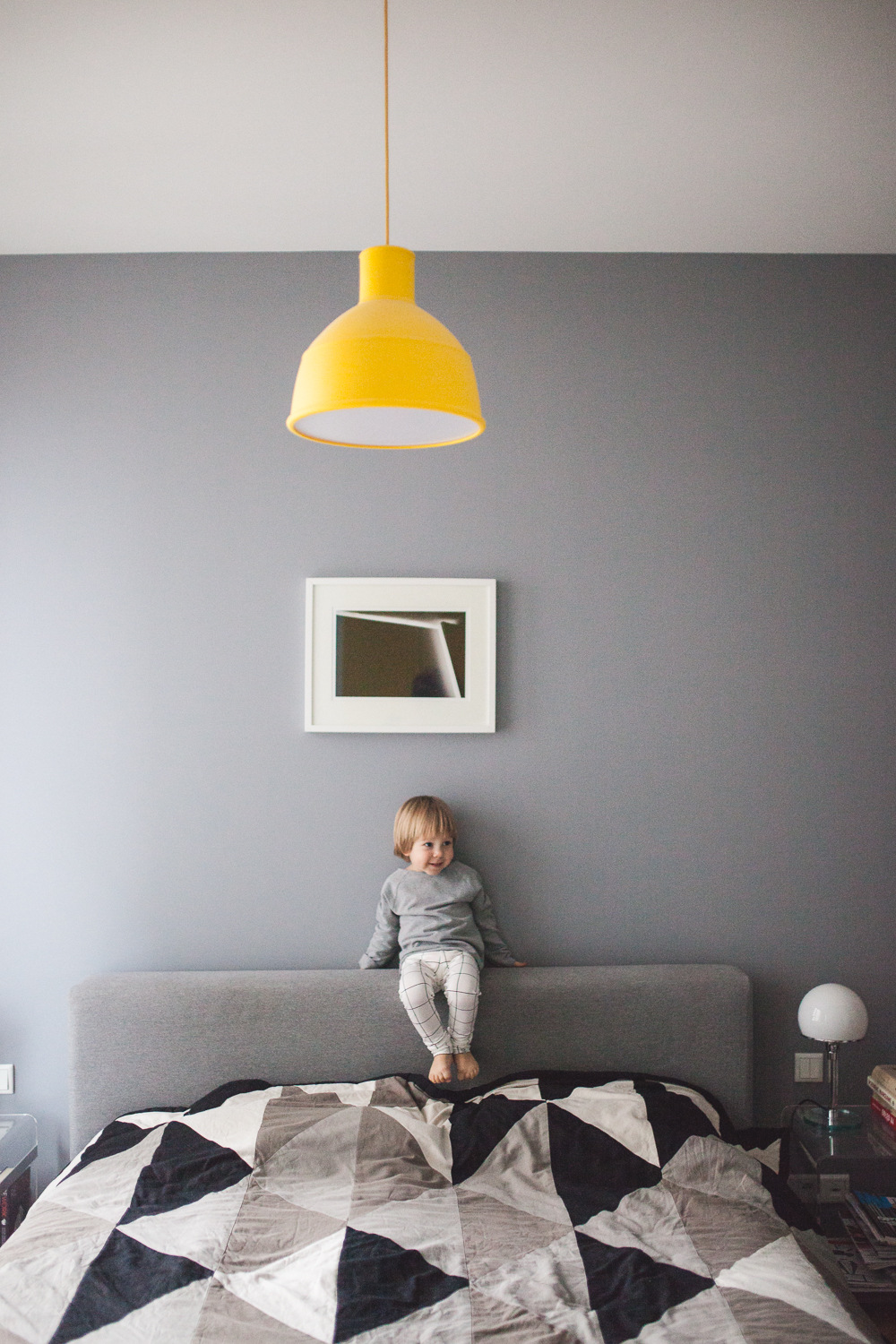 Nie tylko własny pokój jest fajny. Łóżko rodziców to chyba ulubione miejsce wszystkich maluchów. Trampolina, miejsce rodzinnych przytulanek, długich rozmów i zabaw. Sypialnia rodziców jest utrzymana w szarościach, ale rozweselona żółtym kolorem, który znajdziemy nie tylko na lampie i wieszakach, ale i na całej ścianie. Czarny kolor dominuje w meblowych dodatkach, jak stolik – taboret Petite Friture czy Drop Chair Arne Jacobsen.