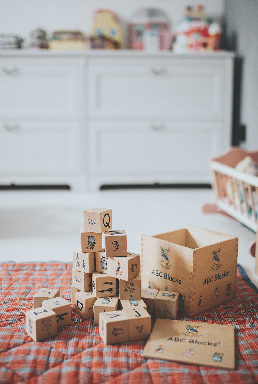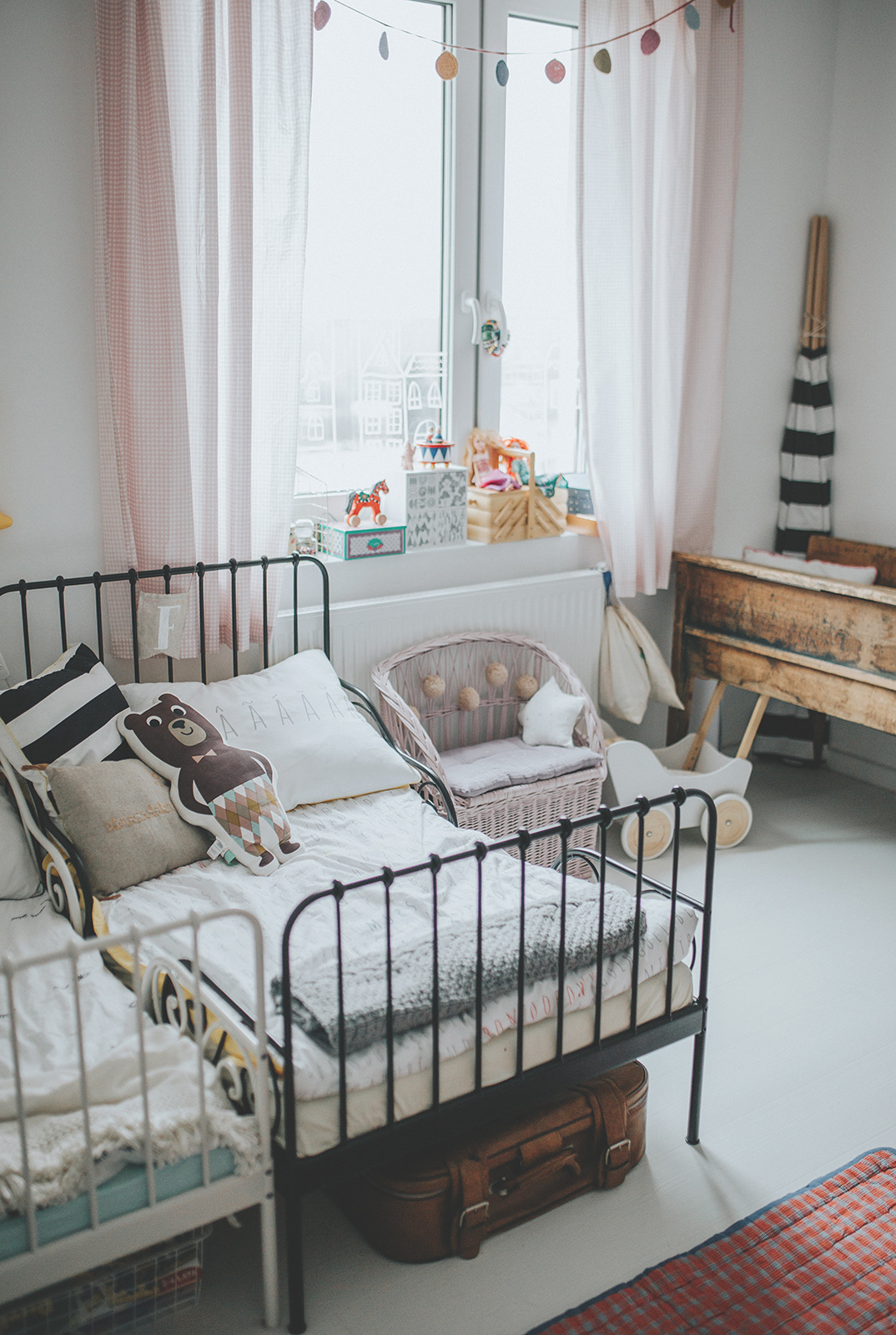 Skarbów, jak to w dziecięcych pokojach, nie brakuje – genialna drewniana ławka wyniesiona ze strychu zamkniętej szkoły, skrzynia na zabawki, skórzana walizka pod łóżkiem, skrywająca stroje księżniczek i masa pięknych zabawek – nie tych designerskich, które znajdziemy wszędzie, a odziedziczonych po rodzicach i tych mających faktycznie cieszyć dzieci : zamek ukryty w walizce od Janod, figurki księżniczek Disneya, świnka Peppa z rodziną, kolorowe koraliki i dużo książek i puzzli, które dziewczynki uwielbiają. Liczne pudełka, schowki i worki kryją jeszcze więcej dziewczęcych skarbów!