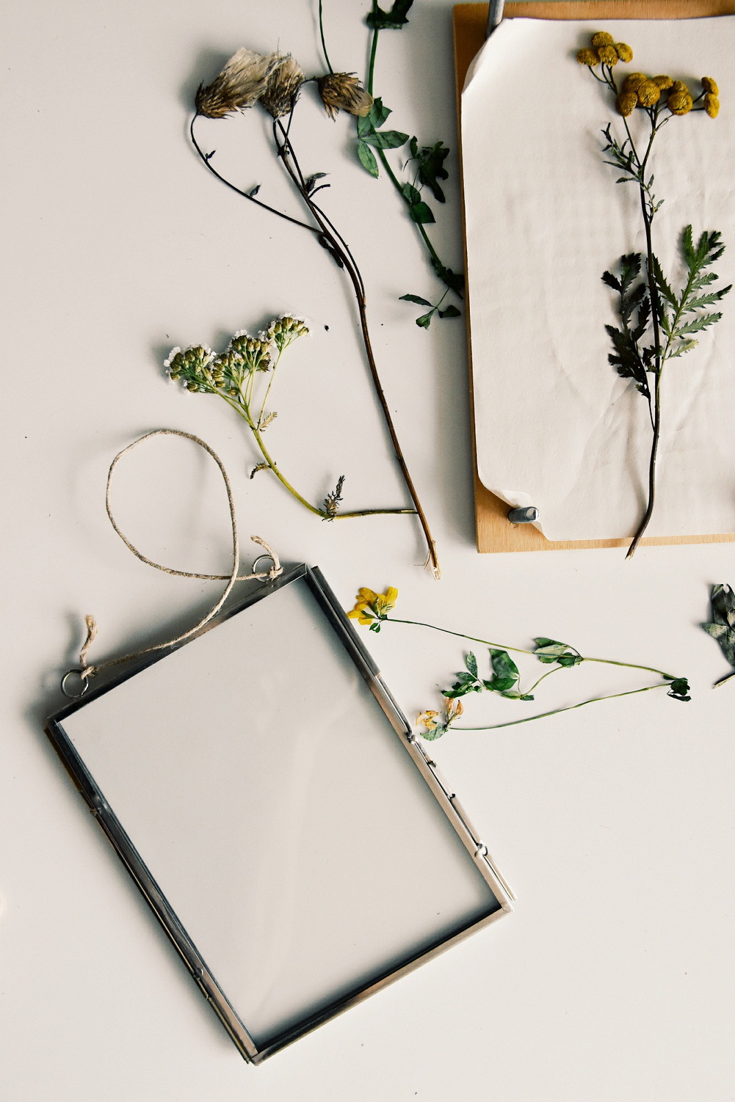 Dodatkowo z zasuszonych kwiatów można też wybrać jeden najbardziej udany i przymocować go taśmami washi do tekturki. Gotową kompozycję umieszczamy w szklanej ramce.