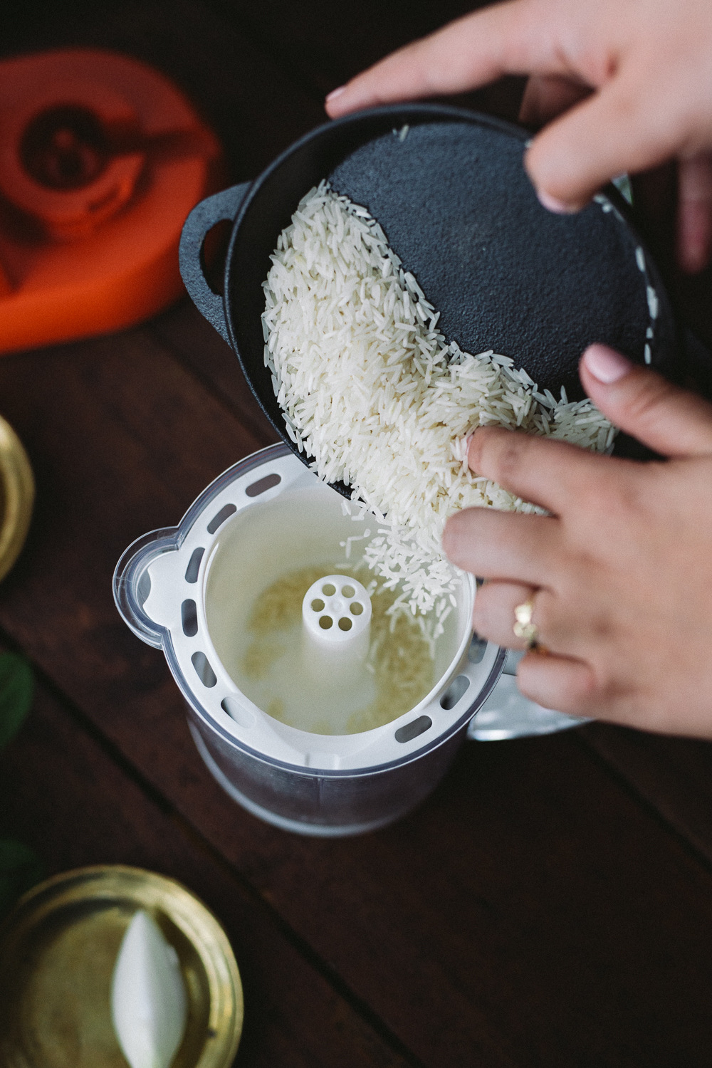 Do naczynia do gotowania Babycook Beaba wrzucamy ryż, pokrojone w plasterki szparagi, pokrojoną w kostkę cebulę, i gotujemy zgodnie z instrukcją na urządzeniu. Babycook to nie tylko poręczny blender, ale król kuchennego multitaskingu, świetnie rozmraża czy gotuje na parze w specjalnych koszyczkach. Kiedy ryż jest miękki, dodajemy zioła, masło i parmezan. Mieszamy i podajemy ciepłe. Opcjonalnie solimy. Proste? I szybkie, ledwo wypiłyśmy lemoniadę, a już danie gotowe. Szkoda tylko, że nie czujecie zapachu ziół i szparagów, bo po daniu już nic nie zostało.